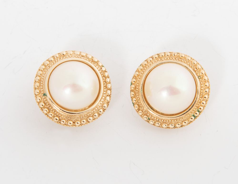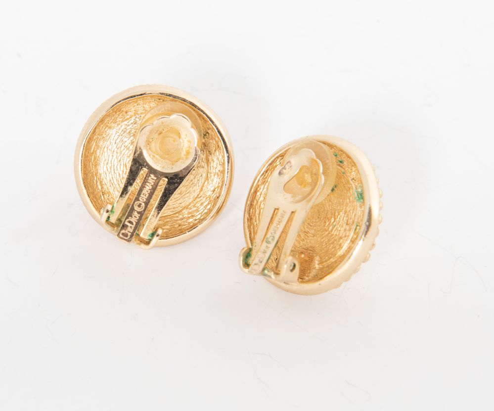 CHRISTIAN DIOR Orecchini a clip in metallo dorato centrati da perle sintetiche. Diametro: cm 2,4 cad. Ciascuno reca marchi Chr. Dior, Germany.