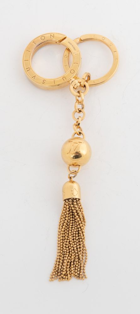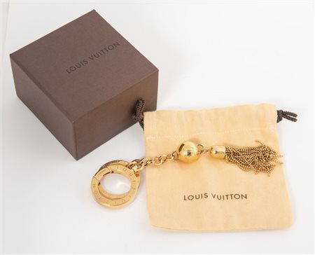 LOUIS VUITTON Charm portachiavi in metallo dorato. Cm 18x4. Reca marchi LV, Louis Vuitton, Made in Italy. Corredato di dustbag e scatola originale.