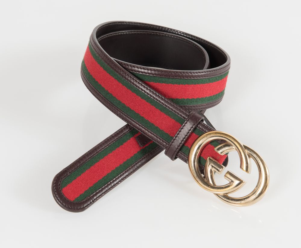 GUCCI Cintura in tela nel classico motivo a righe web con rifiniture in pelle marrone e fibbia in metallo dorato. Lunghezza totale: cm 100. Spessore fascia: cm 4. Fibbia: cm 5,2x8. Reca marchi Gucci Made in Italy e codice di riferimento prodotto.