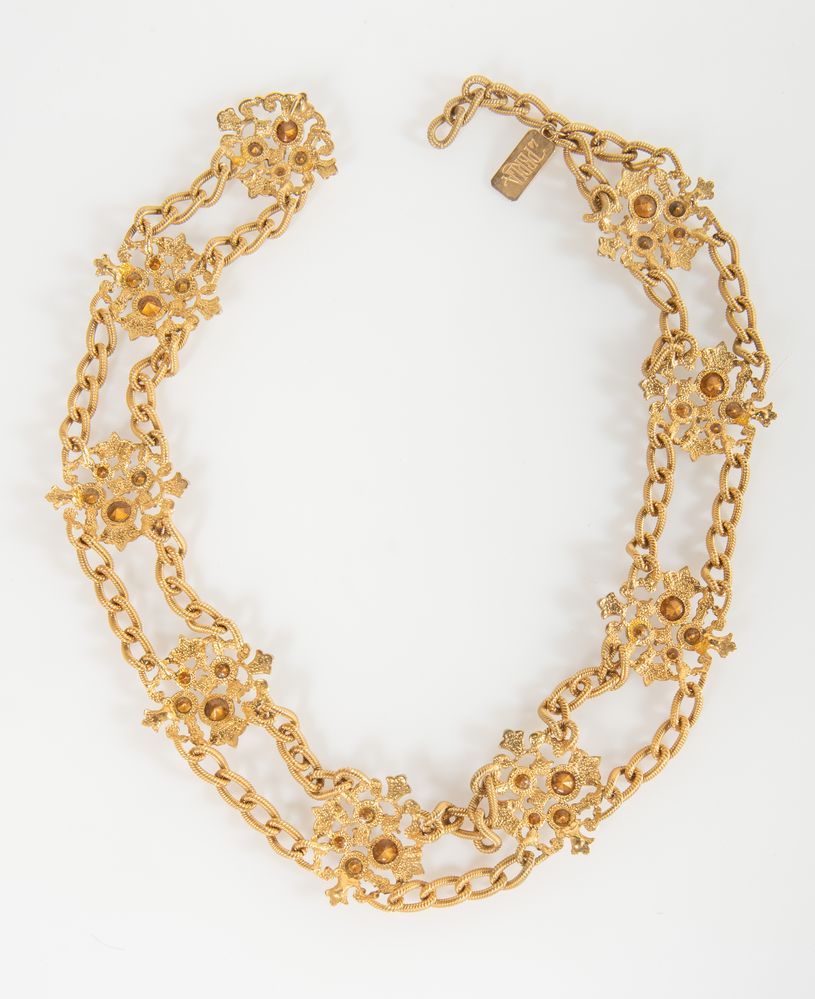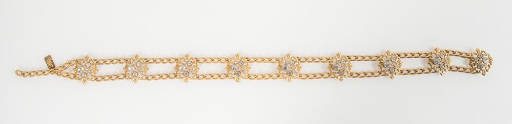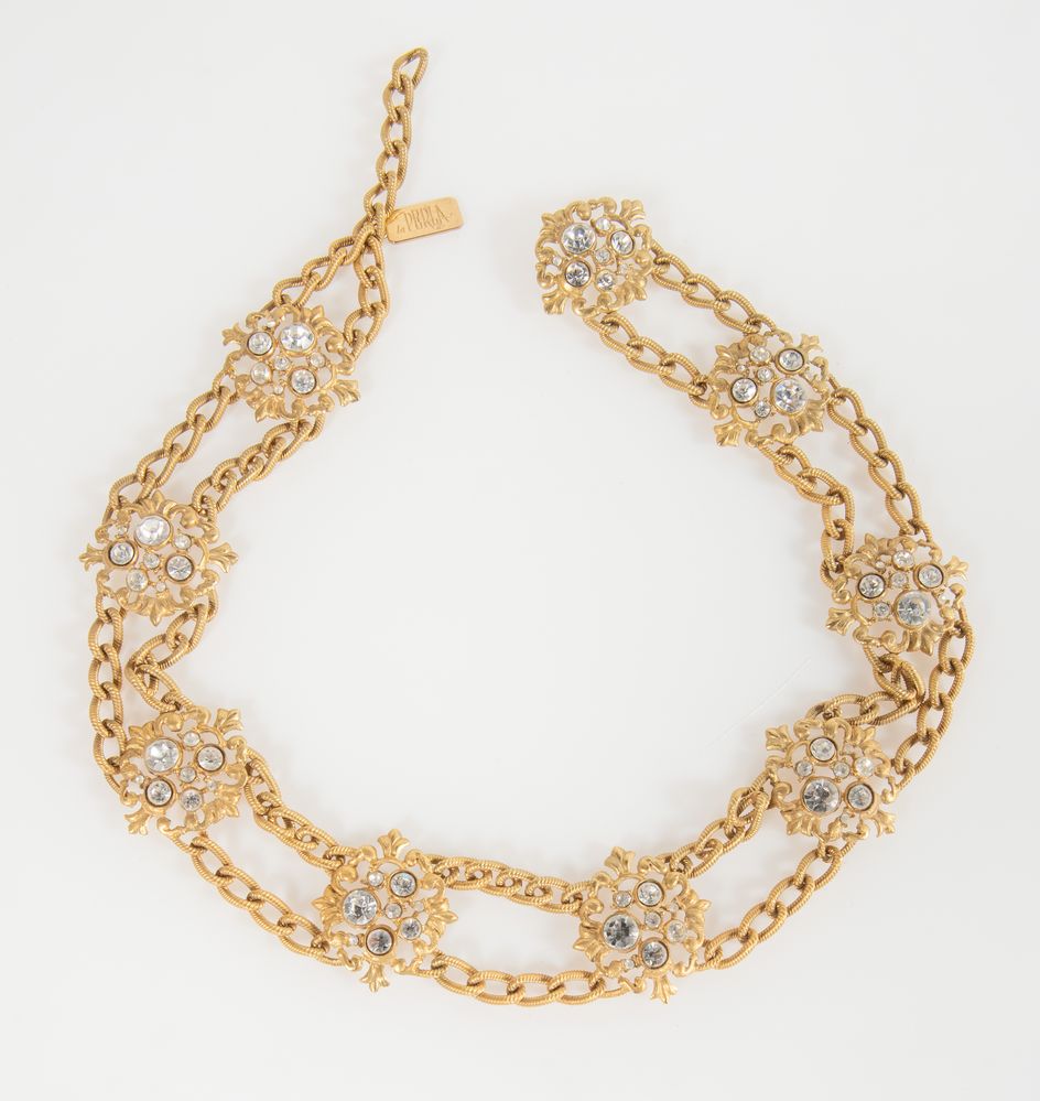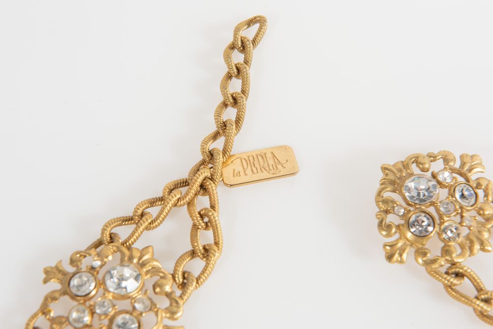 LA PERLA Cintura in metallo dorato realizzata a catena decorata con strass di grandi, medie e piccole dimensioni. Lunghezza totale: cm 83. Reca targhetta con marchio La Perla.