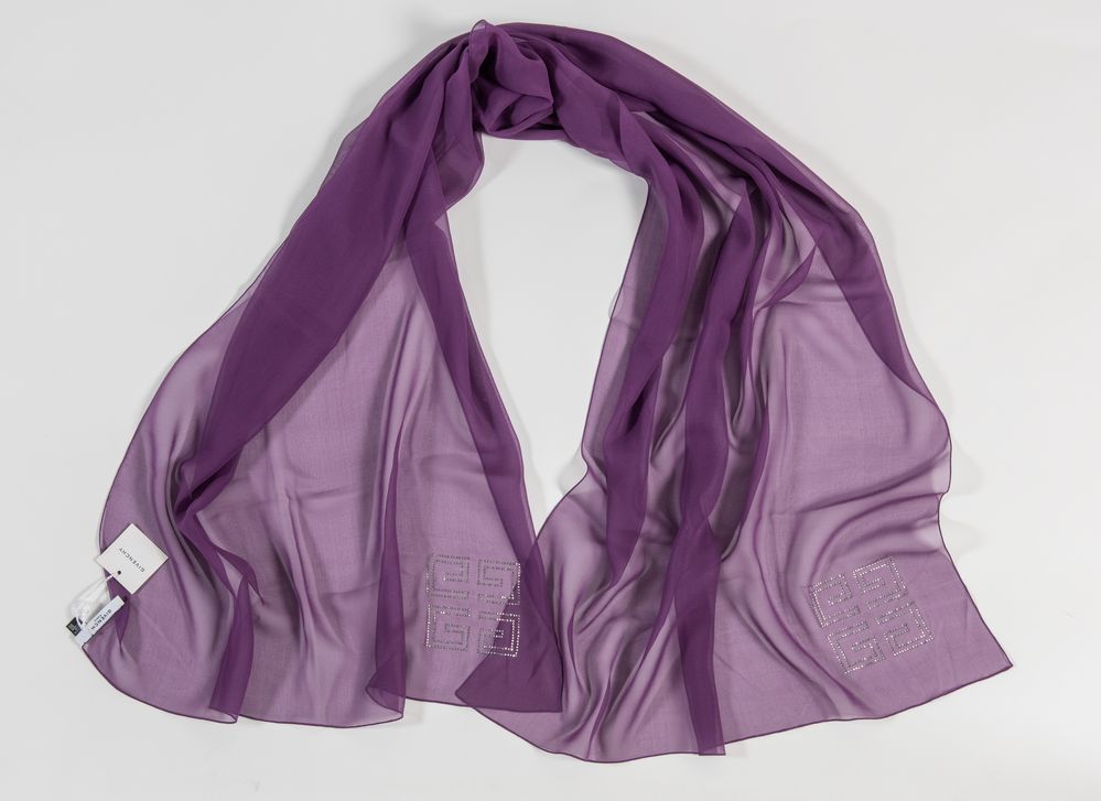 GIVENCHY Stola in seta semi trasparente viola arricchita con logo di strass. Cm 178x67. Composizione: 100% seta. Reca etichette Givenchy Paris, Givenchy e Made in Italy.