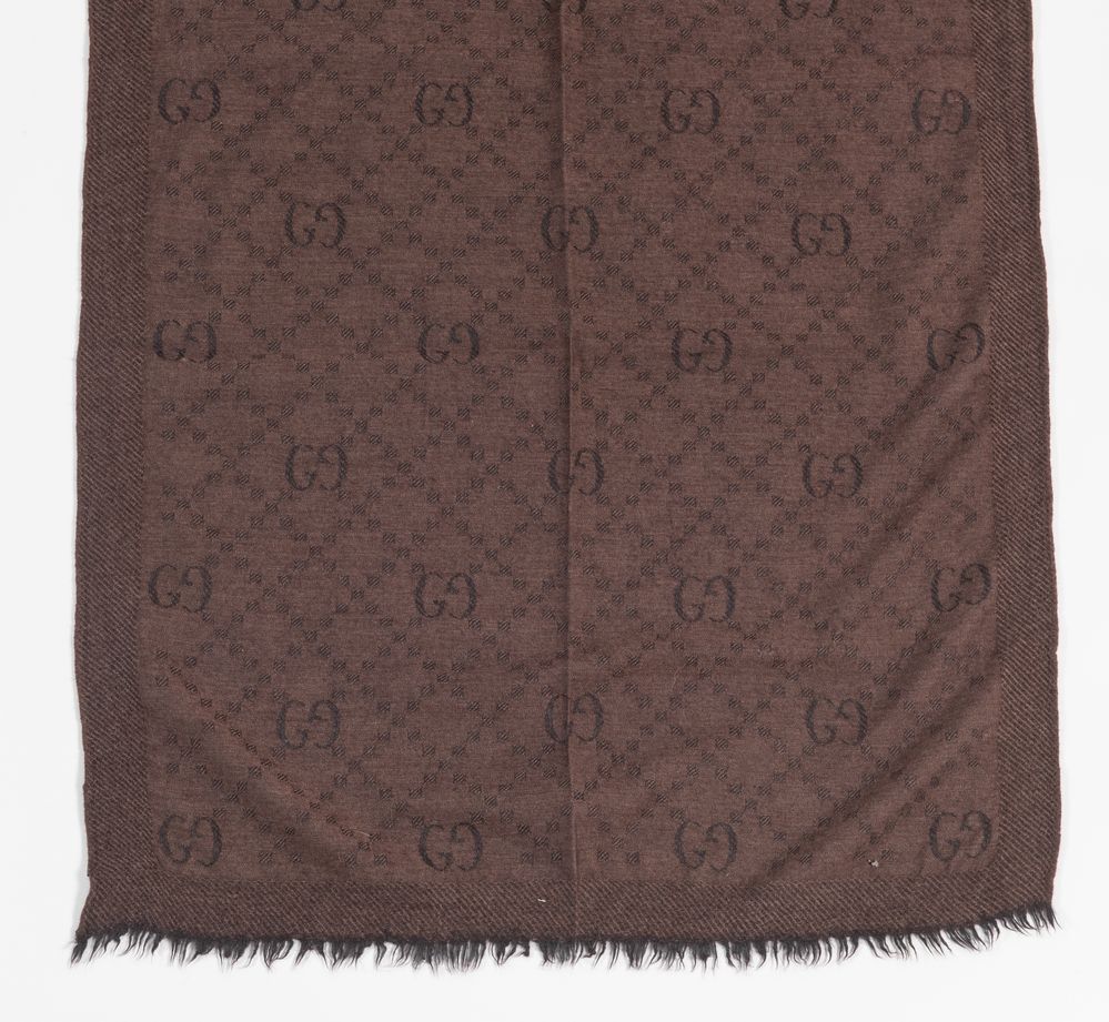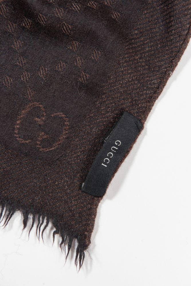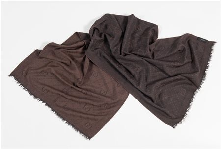 GUCCI Sciarpa in lana e seta logata sui toni del marrone. Cm 61x156. Composizione: 70% lana, 30% seta. Reca etichetta Gucci Made in Italy.