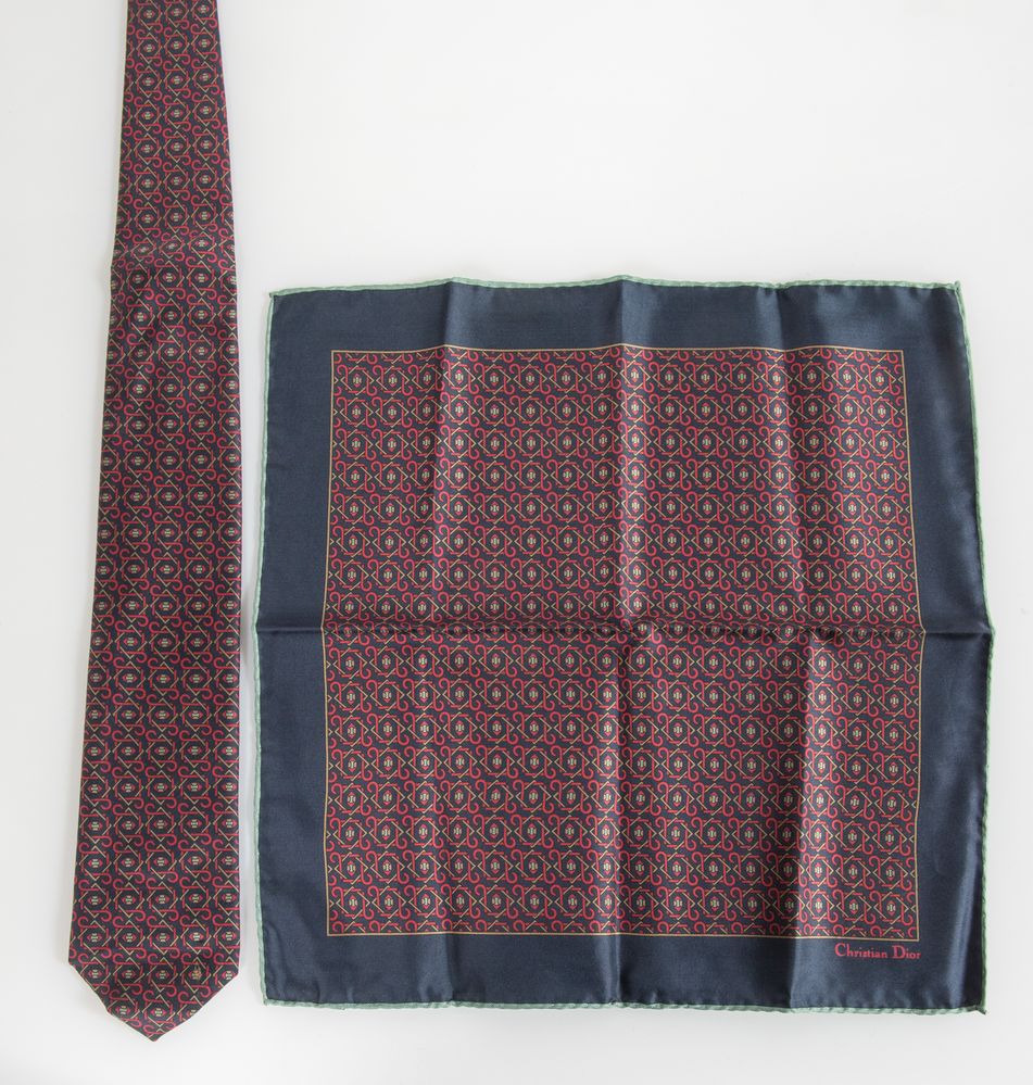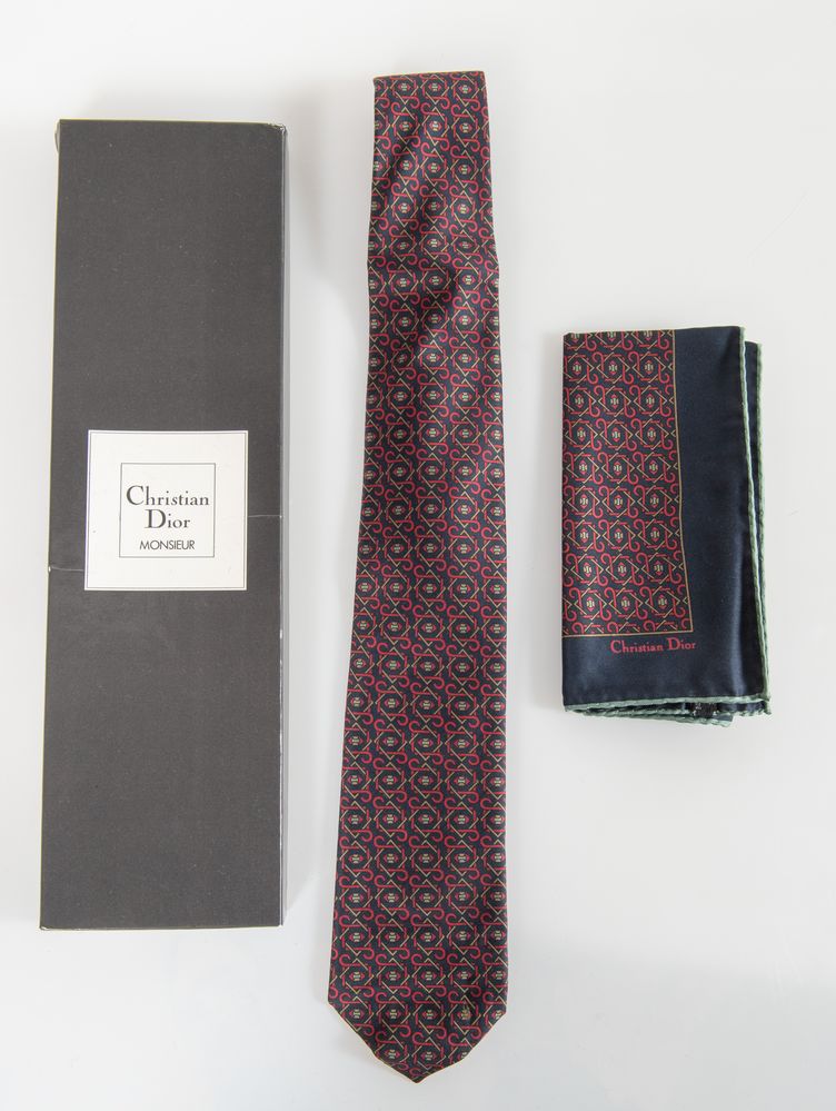 CHRISTIAN DIOR Monsieur Set composto da cravatta e fazzoletto da taschino. Cravatta: lunghezza totale cm 142; Fazzoletto: cm 34,5x34,5. Composizione: 100% seta. Recano marchi Christian Dior, e Christian Dior Monsier Paris Made in France. Corredati di scatola originale.