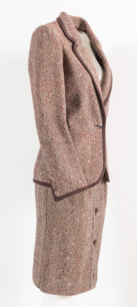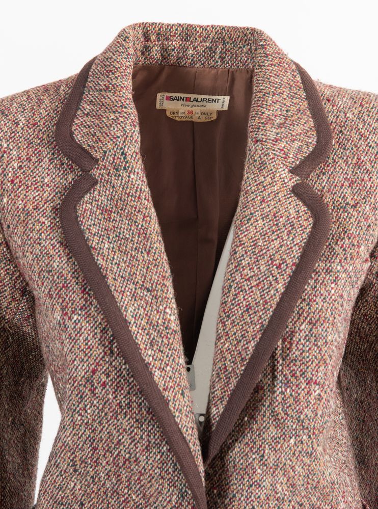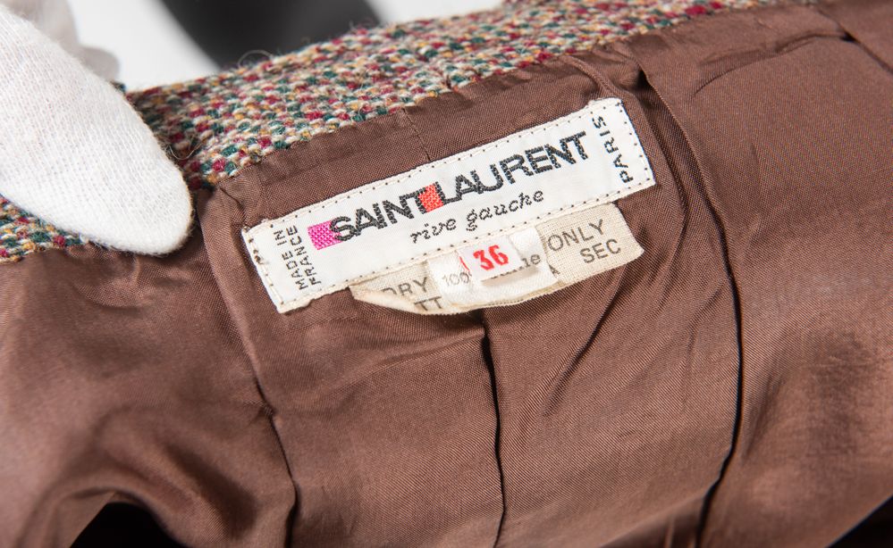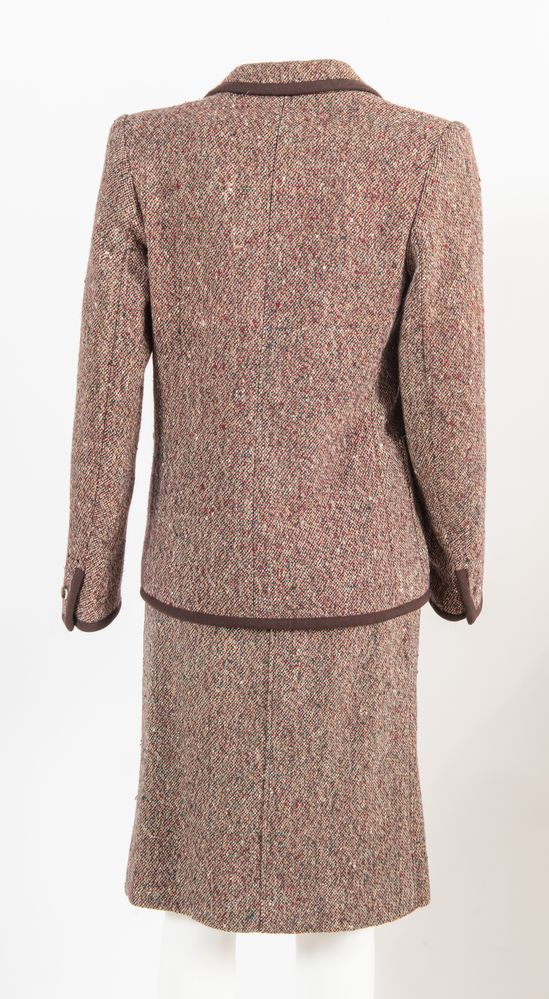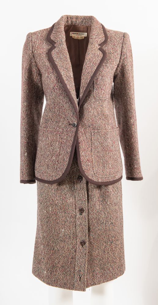 SAINT LAURENT Rive gauche Completo tailleur in lana lavorata composto da giacca e gonna sui toni del marrone con interno rivestito in seta. Gonna: riporta taglia 36. Giacca: riporta taglia 38. Composizione esterno: 100% lana. Reca etichette Saint Laurent rive gauche Paris Made in France.