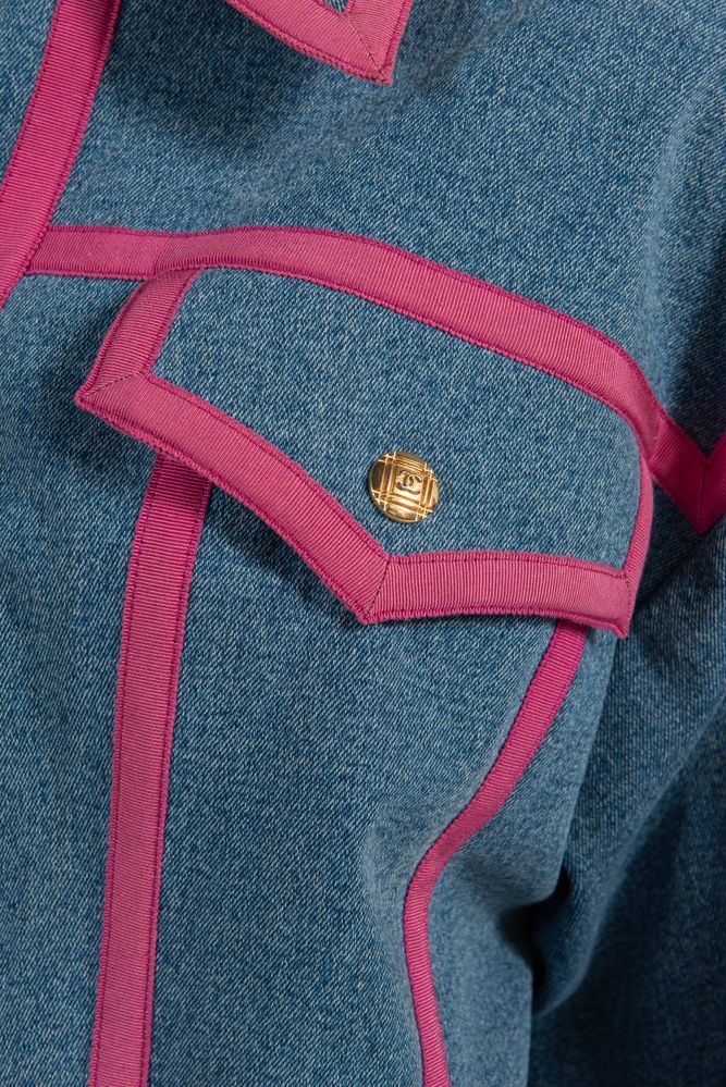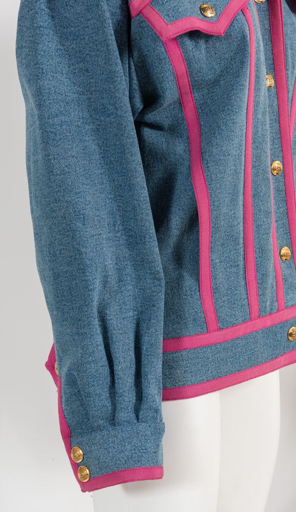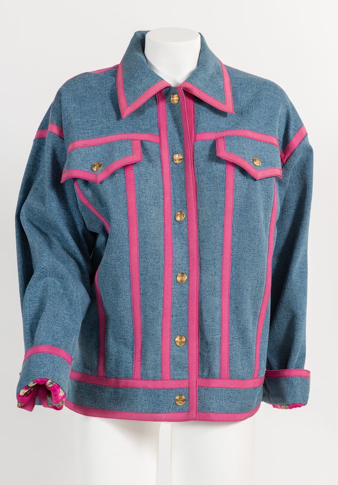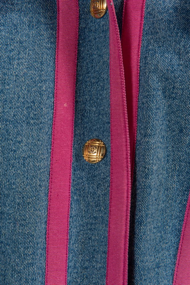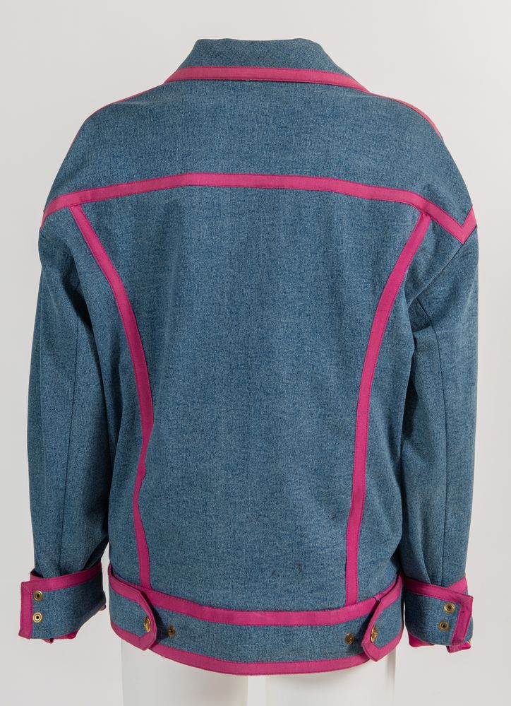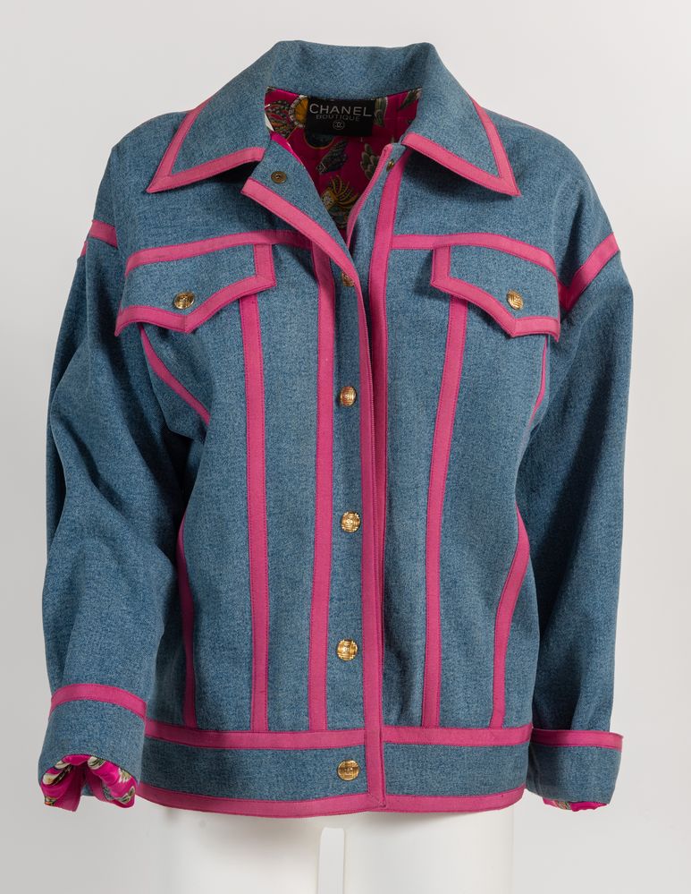 CHANEL Boutique Giacca modello bomber oversize in tessuto denim con rifiniture in seta fucsia e bottoni in metallo dorato. Collezione anno 1991 "Hip Hop" Runway Collection disegnata da Karl Lagerfeld. Interno in seta trapuntata interamente disegnata e rifinita con catena in metallo dorato lungo il perimetro della vita. Taglia non riportata: IT 40-42 ca. (Lievissime mancanze)