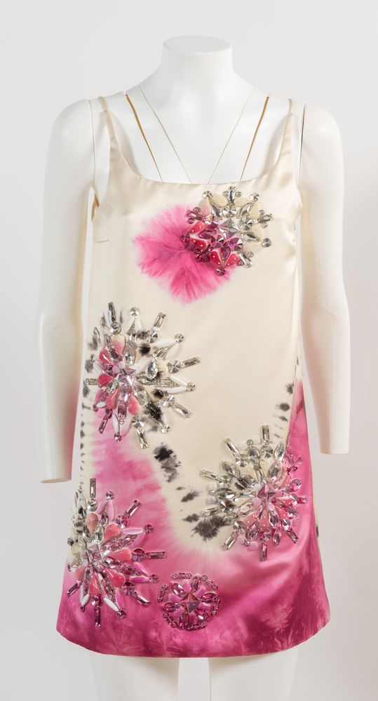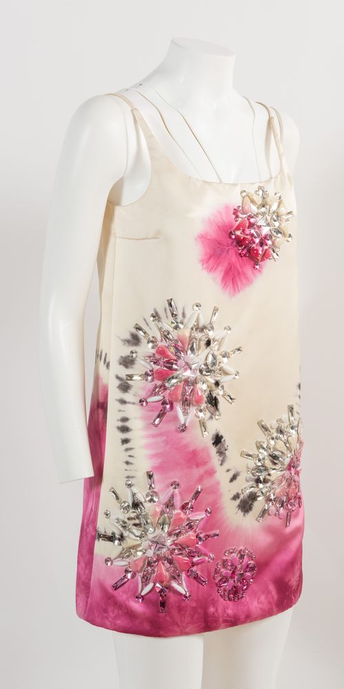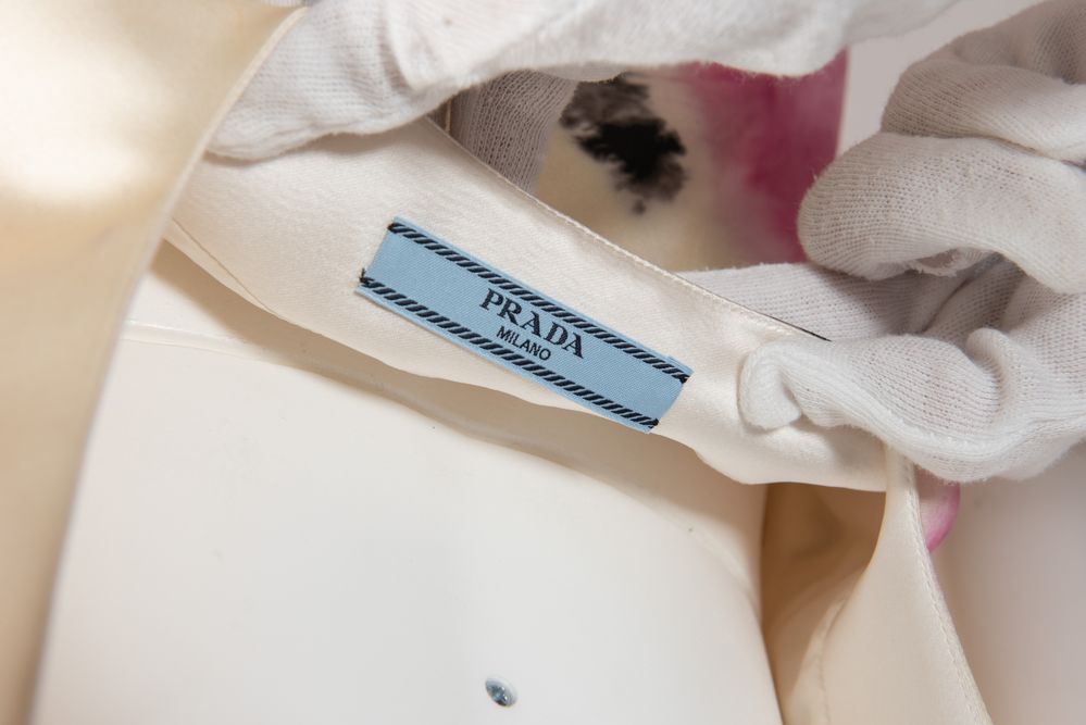 PRADA Milano Mini abito in seta sui toni del bianco panna e del rosa arricchito da importati ricami di pietre sintetiche, metalliche e vitree. Taglia riportata: 38. Composizione esterno: 100% seta. Composizione fodera interna: 60% cupro, 40% seta. Reca etichette Prada Milano e Made in Italy.