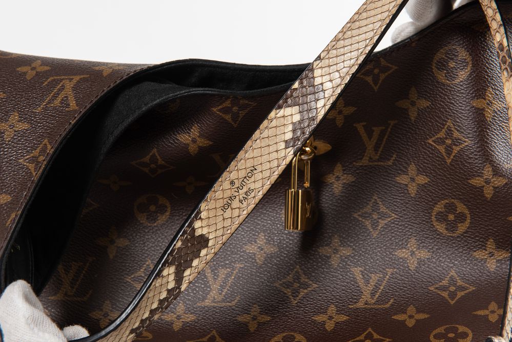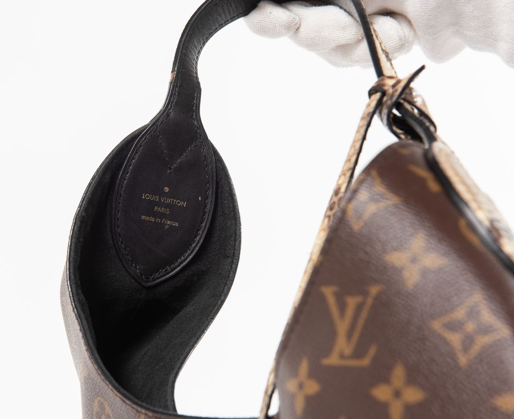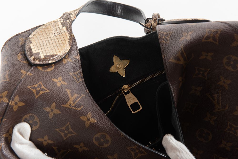 LOUIS VUITTON Borsa da spalla modello Flower Hobo in tela monogram. Inserti e rifiniture in pelle di pitone e dettagli in metallo dorato. Collezione anno 2018. Cm 39x39x18. Altezza con manico: cm 50. Interno in tela nera con due tasche di cui una chiusa da cerniera. Reca marchi LV, Louis Vuitton, Louis Vuitton Paris, Louis Vuitton Paris Made in France e codice di riferimento prodotto. Corredata di lucchetto con chiavi con rispettiva bustina e dustbag originali.