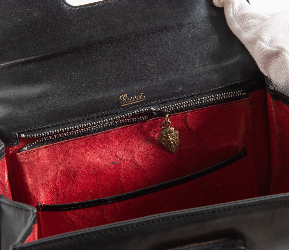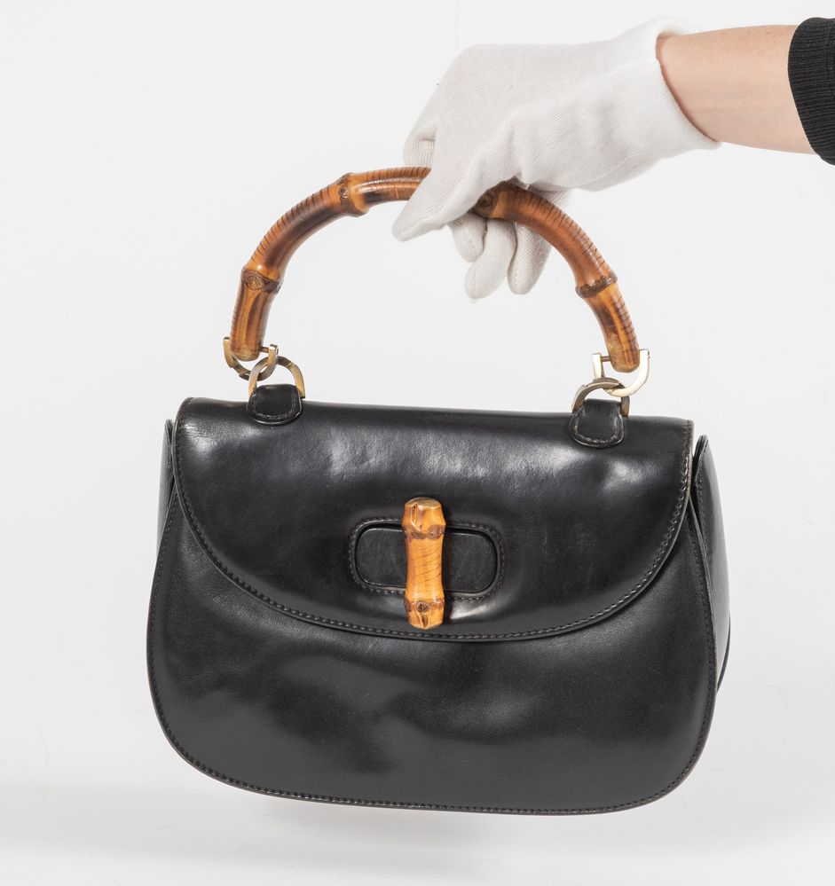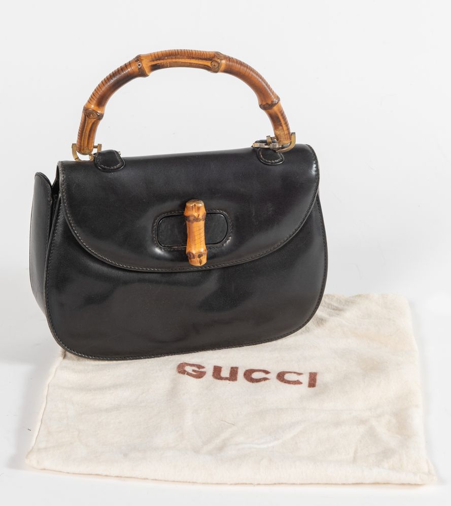 GUCCI Borsa in pelle liscia nera modello Bamboo con manico e dettaglio della chiusura in legno. Cm 19x26,5x7,5. Altezza con manico: cm 29. Interno in pelle rossa con tre tasche di cui una chiusa da cerniera. Reca marchi Gucci e Cavaliere. Corredata di dustbag. (Difetti)