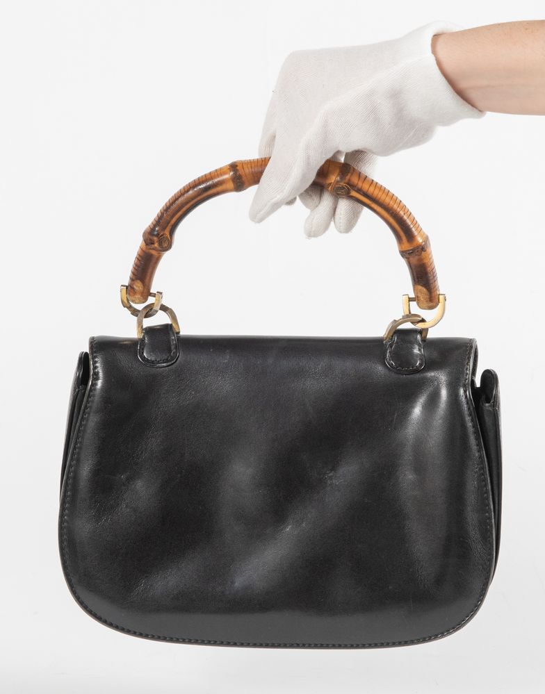 GUCCI Borsa in pelle liscia nera modello Bamboo con manico e dettaglio della...