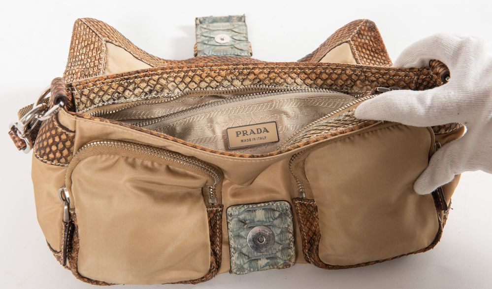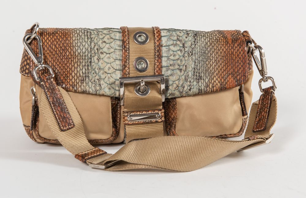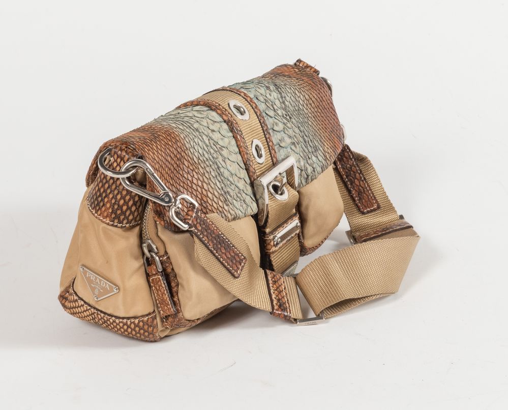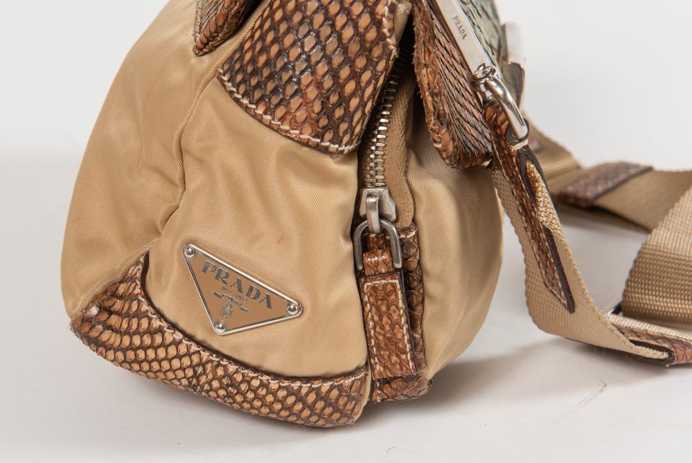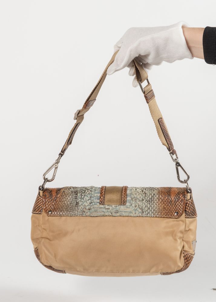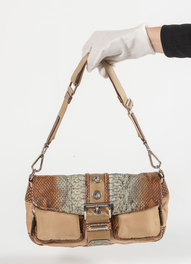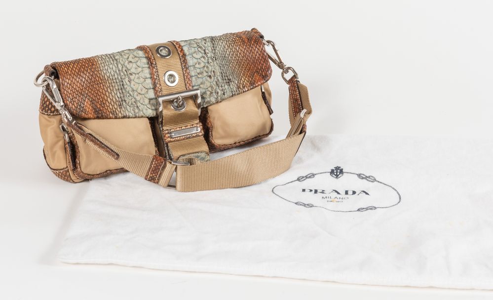 PRADA Borsa da spalla in nylon sui toni del beige e del marrone con rifiniture in pelle di pitone. Dettagli in metallo argentato e manico in nastro nylon rimovibile. Sotto la patta sul lato frontale sono presenti due taschine chiuse da cerniera. Cm 16x28x11. Lunghezza massima manico: cm 80. Interno in tela beige logata con tasca chiusa da cerniera. Reca marchi Prada, Prada Milano dal 1913, Prada Made in Italy ed etichette con numero e codice di riferimento prodotto. Corredata di dustbag. (Lievissimi difetti)