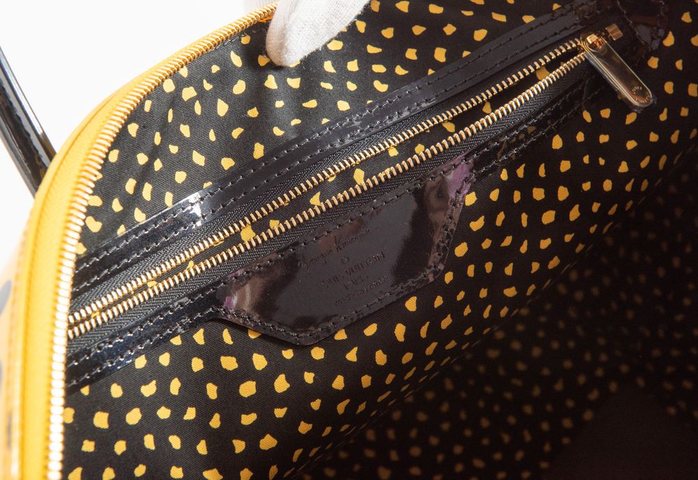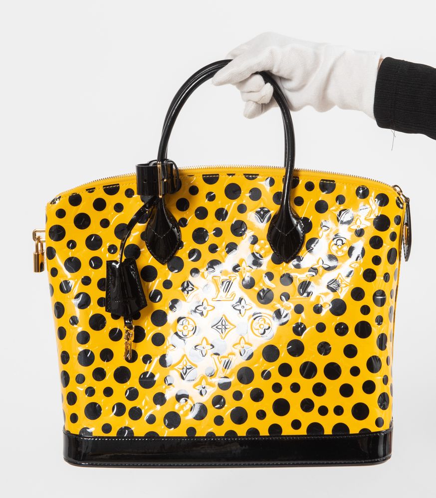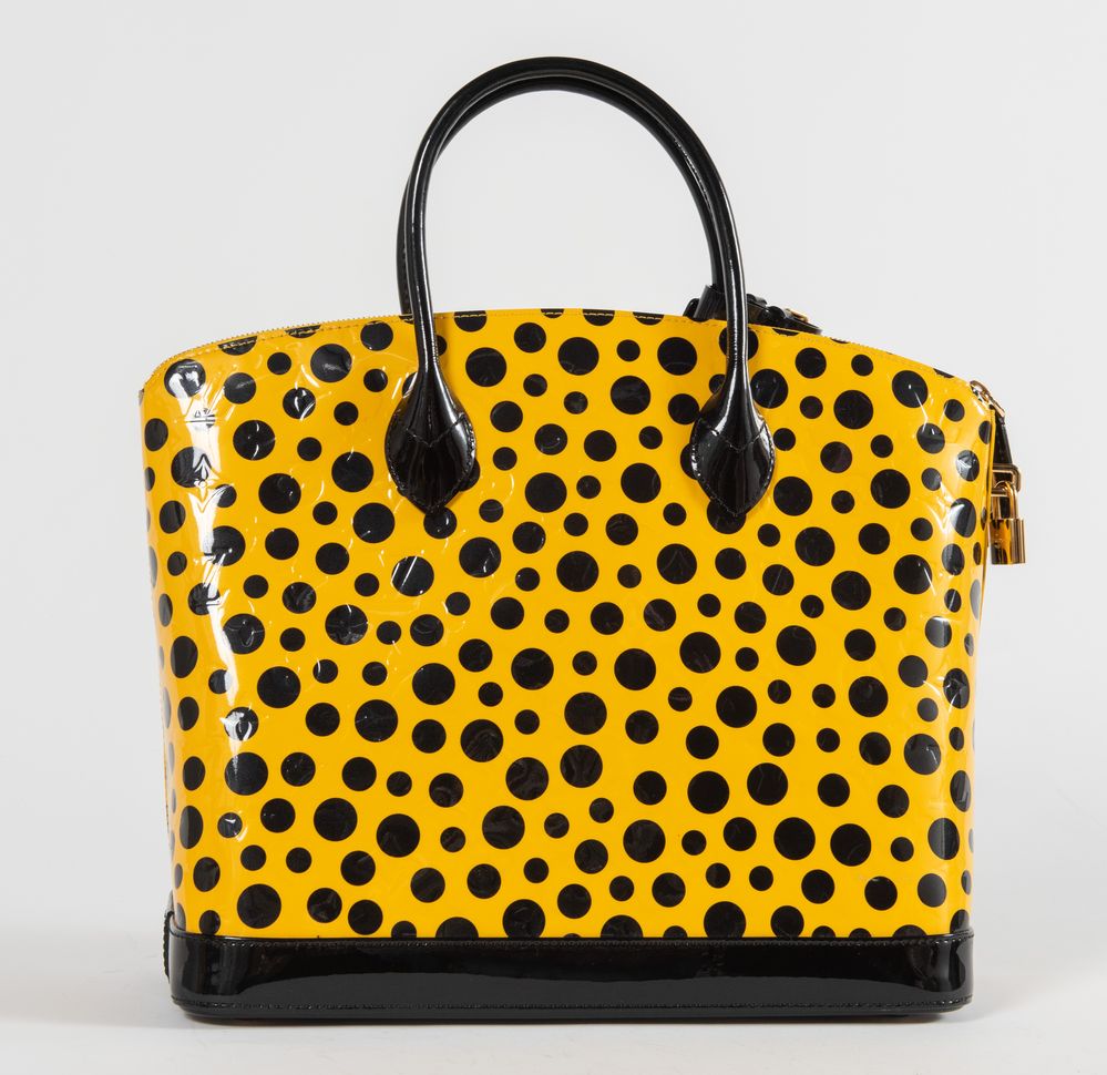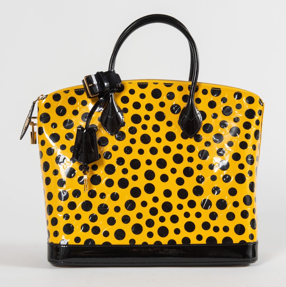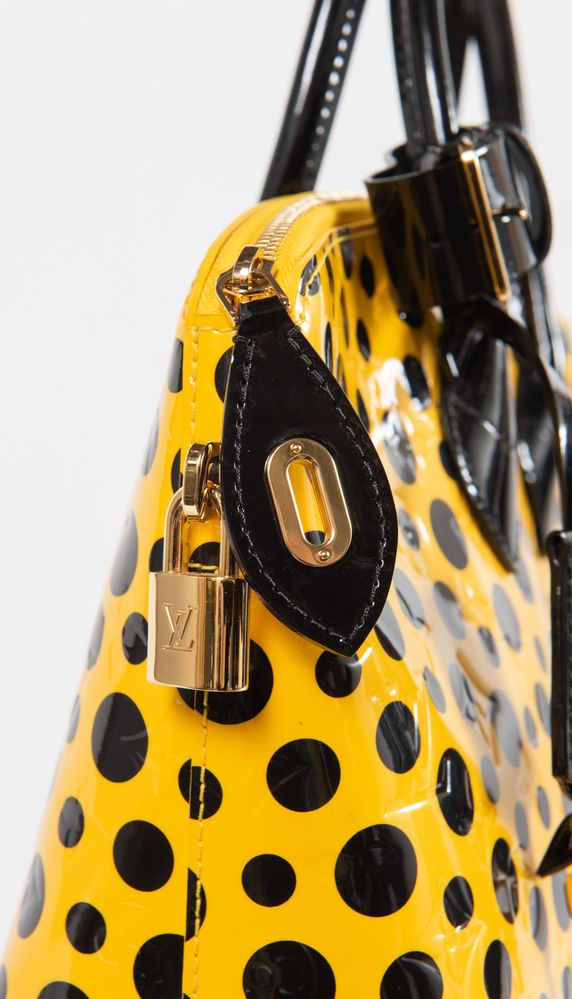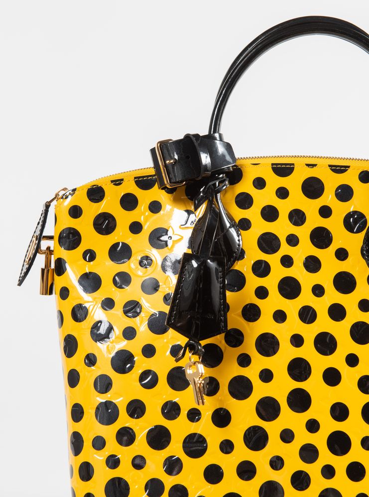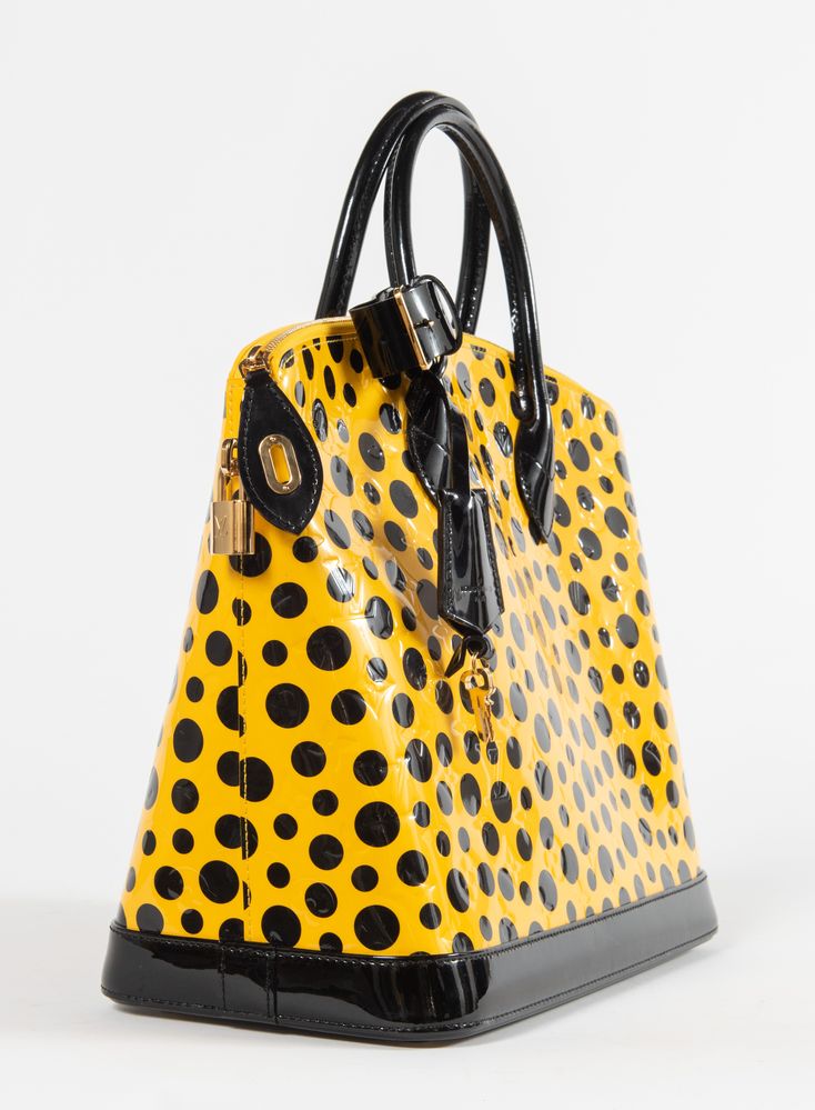 LOUIS VUITTON Borsa da spalla modello Lockit MM in tela Vernis monogram a pois sui toni del giallo e del nero. Rifiniture e dettagli in metallo dorato. Edizione limitata dell'anno 2012 realizzata con la collaborazione dell'artista giapponese Yayoi Kusama. Cm 30,5x38,5x18. Altezza con manici: cm 41. Interno in tela a fantasia pois gialla a nera con tre tasche di cui una chiusa da cerniera. Reca marchi LV, Louis Vuitton Paris, Yayoi Kusama Louis Vuitton Paris Made in France e codice di riferimento prodotto. Corredata di lucchetto, chiavi e dustbag originale.