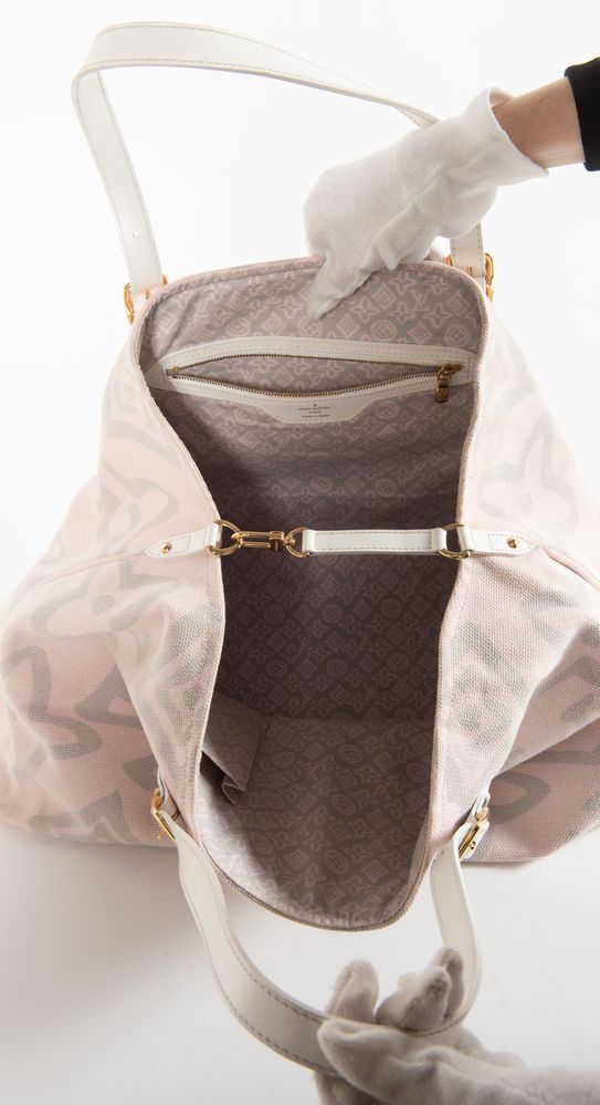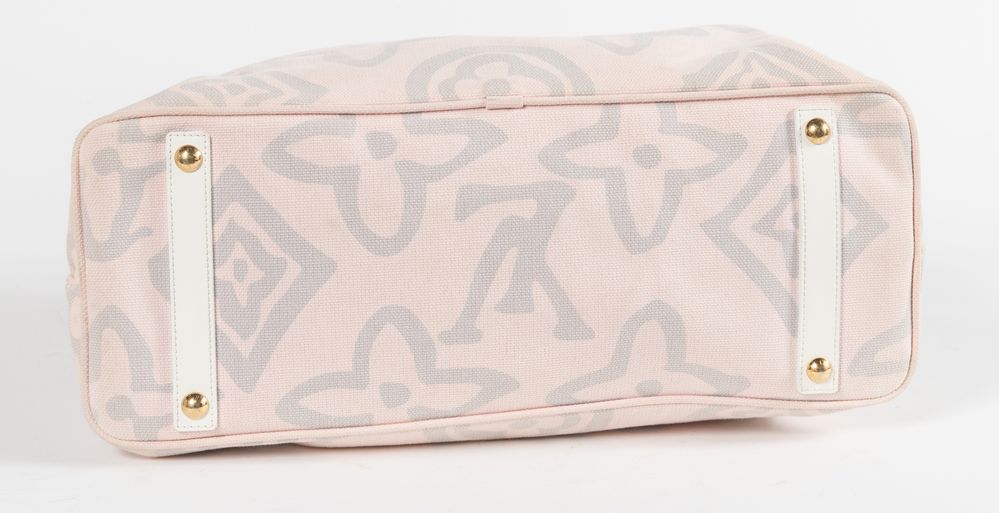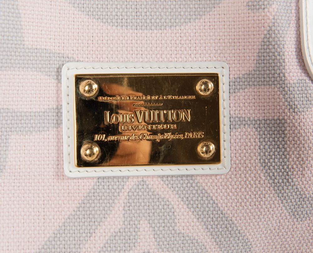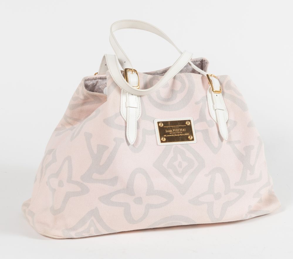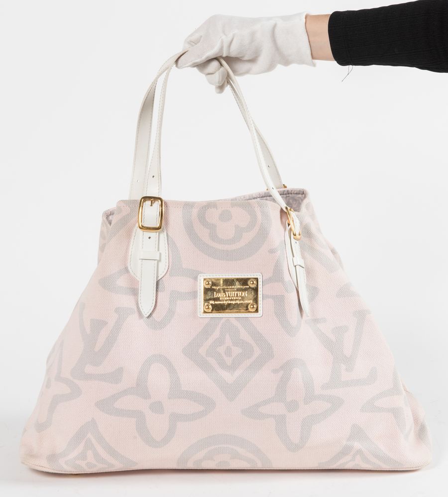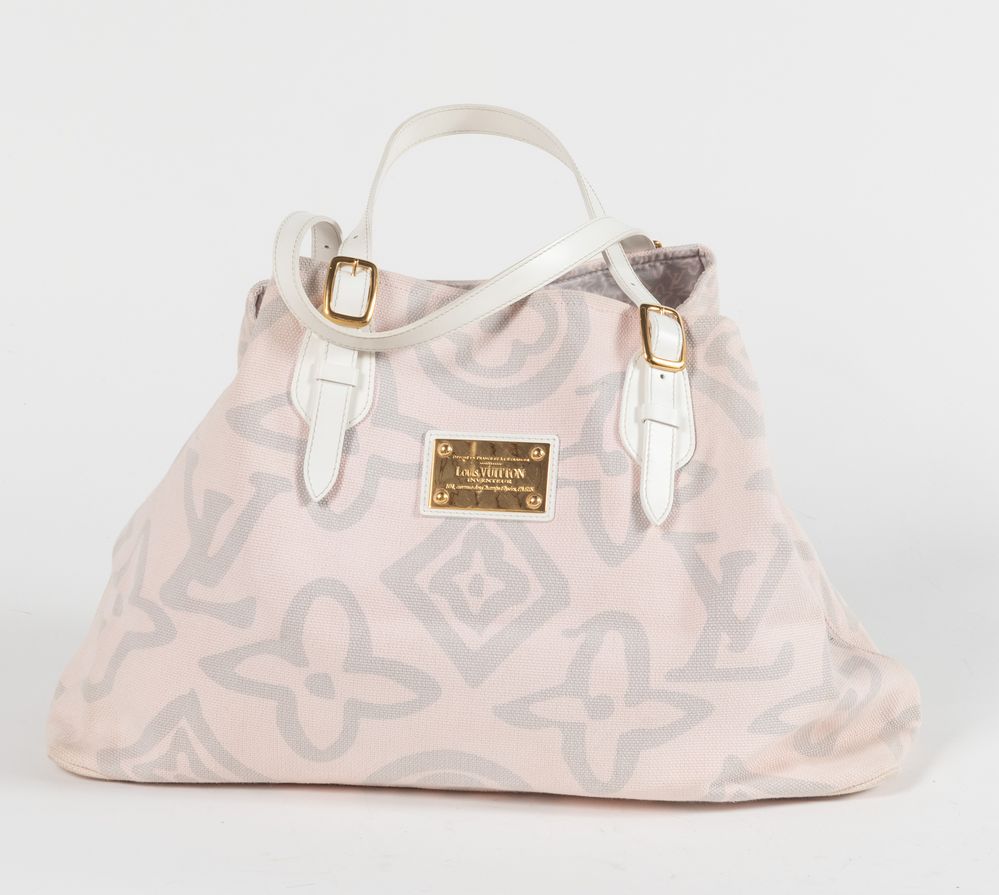 LOUIS VUITTON Borsa da spalla in tela rosa e grigia modello Tahitienne Cabas con manici e rifiniture in pelle bianca e dettagli in metallo dorato. Cm 33x50x20. Altezza con manici: cm 55. Interno in tela logata con due tasche di cui una chiusa da cerniera. Reca targhetta Déposé en France et a l'Etranger Louis Vuitton Inventeur 101, avenue des Champs-Elysées Paris e marchi LV, Louis Vuitton Paris Made in Spain e codice di riferimento prodotto. Corredata di dustbag originale.