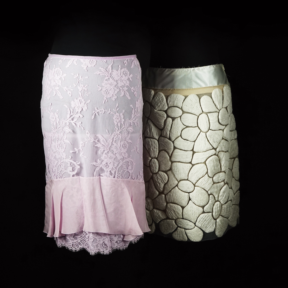 Valentino gonna in tulle decorata da grandi fiori bianchi plissettati applicati (da completare), tg. 8, collezione primavera-estate 2007 UNITA ad altra di pizzo e raso lilla, tg. 42