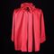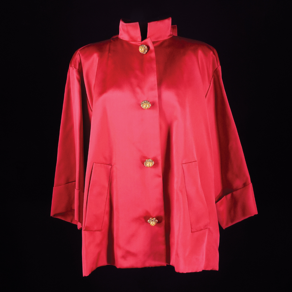 Nina Ricci (attr.) caban di raso rosso aragosta con fiocco e piegone sul dietro; bottoni gioiello