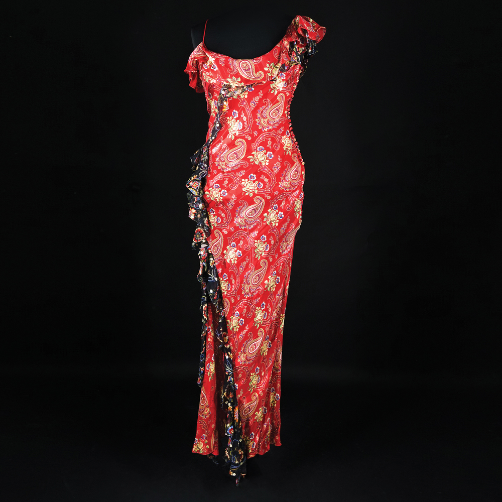Christian Dior abito da sera con spalline in voile di seta rossa a disegno boteh abbellito da ruches a fondo nero