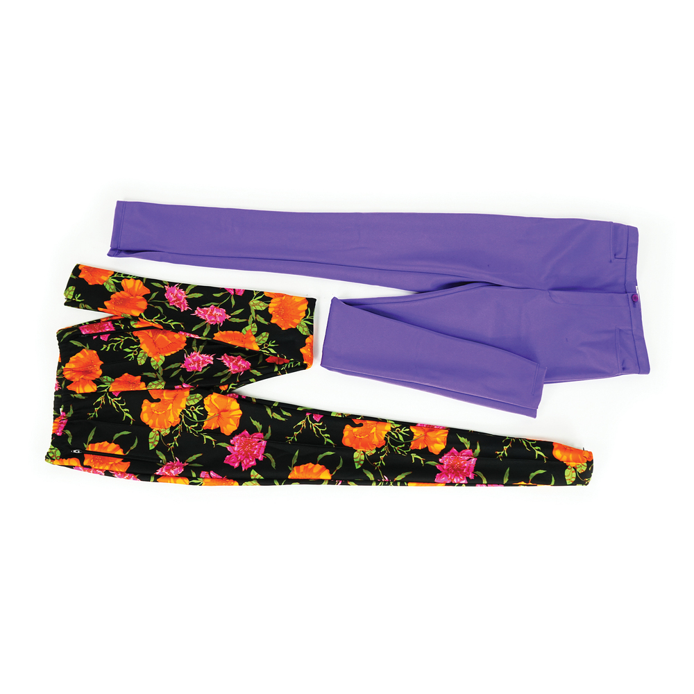 Balenciaga due paia di pantaloni elasticizzati: uno a tinta unita viola; l'altro a stampa floreale in vivace policromia su fondo nero