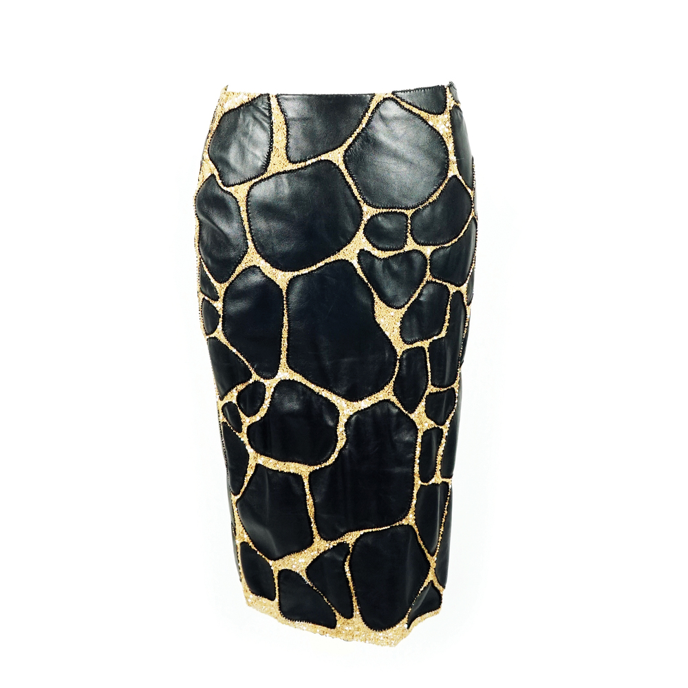Valentino gonna in tulle con applicazioni di pelle marrone a motivo giraffa circondate da ricamo a paillettes dorate.