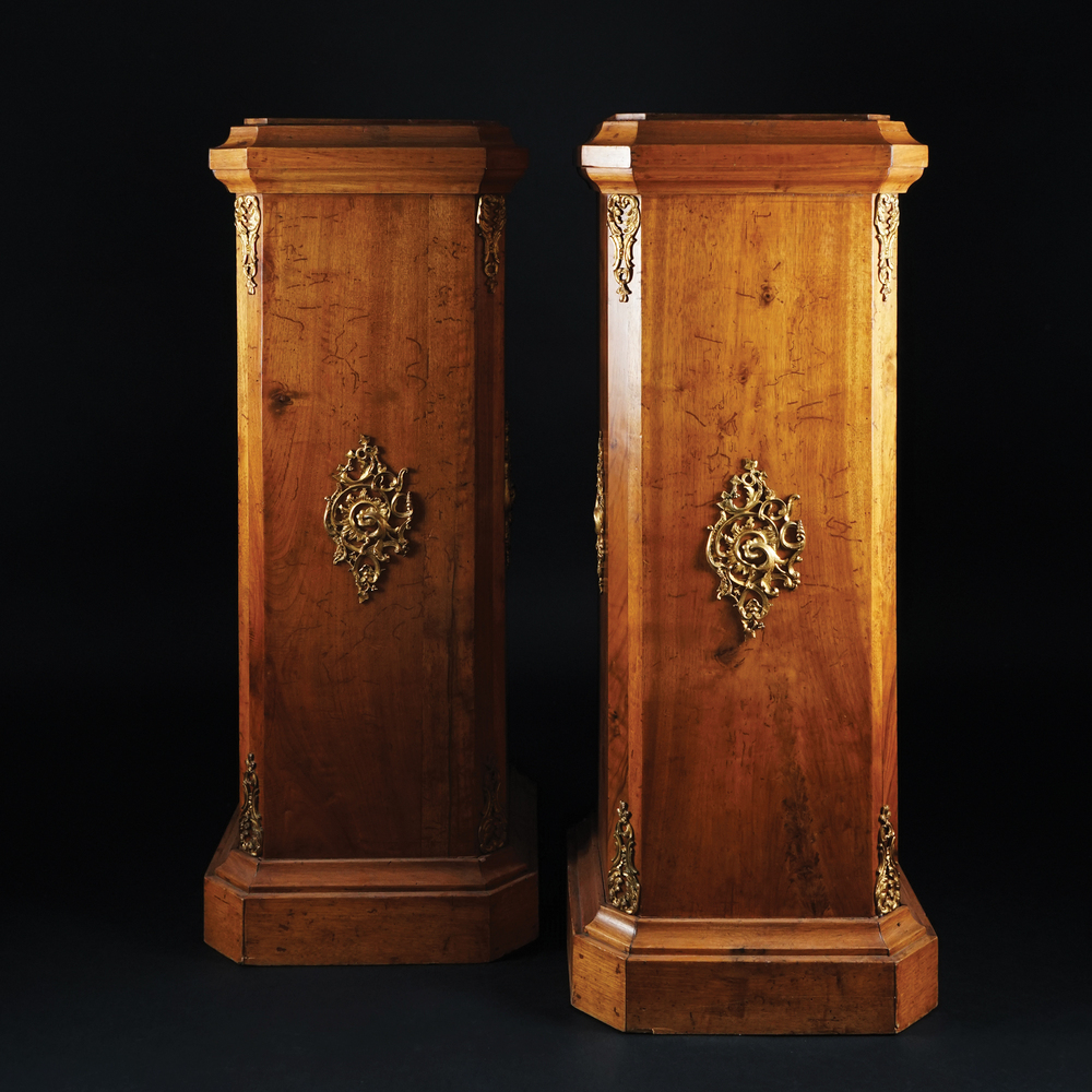 Coppia di piedistalli impiallacciati in noce a sezione quadrata con angoli spezzati, arricchiti da fregi in bronzo dorato e cesellato a volute, cm. 105x40x40