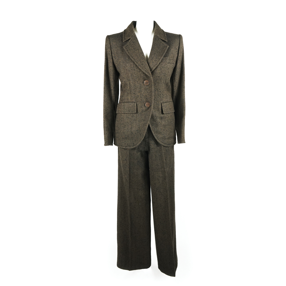 Yves Saint Laurent tailleur in lana spinata marrone e nera composto da giacca e pantalone