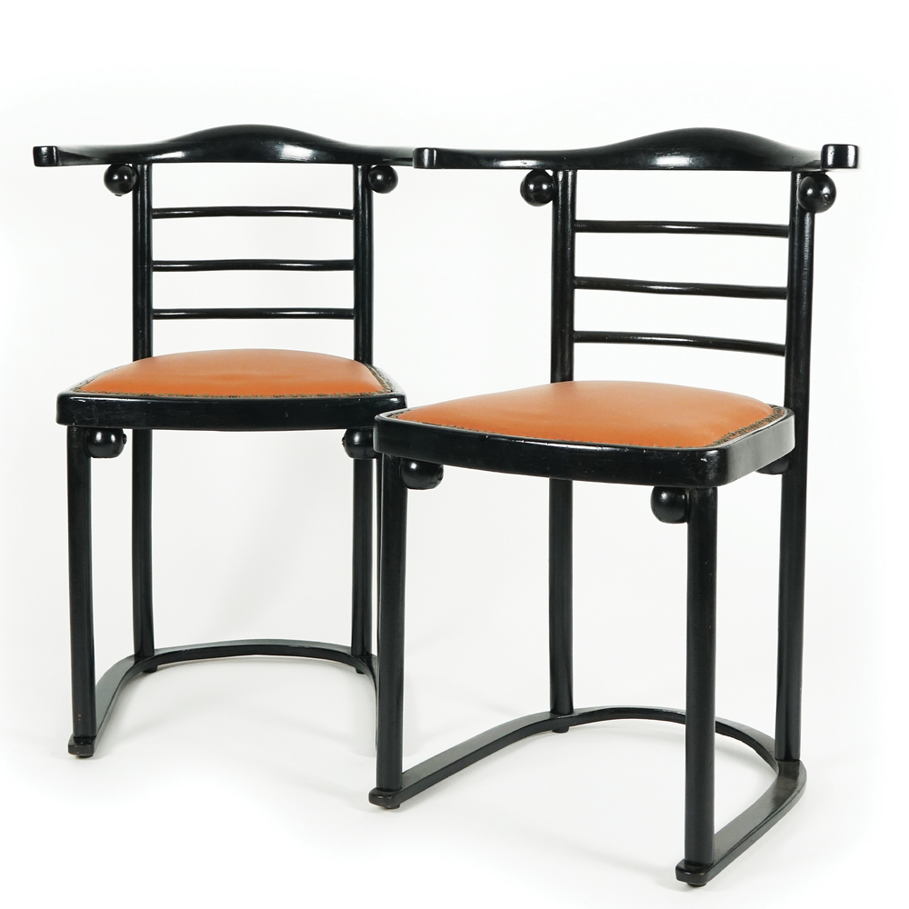 Coppia di poltroncine Fledermaus in faggio ebanizzato curvato a fuoco. Schienale avvolgente a giorno; sostegni a colonnina riuniti da una traversa arcuata.