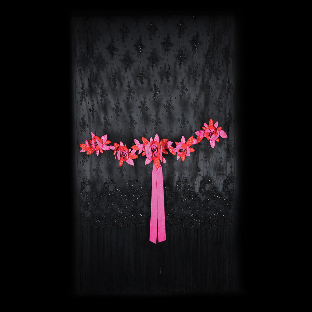Valentino (attr.) stola di pizzo nero con frange arricchito da rose e foglie applicate nei toni del fucsia e del rosso, cm. 250x95 circa complessivamente