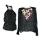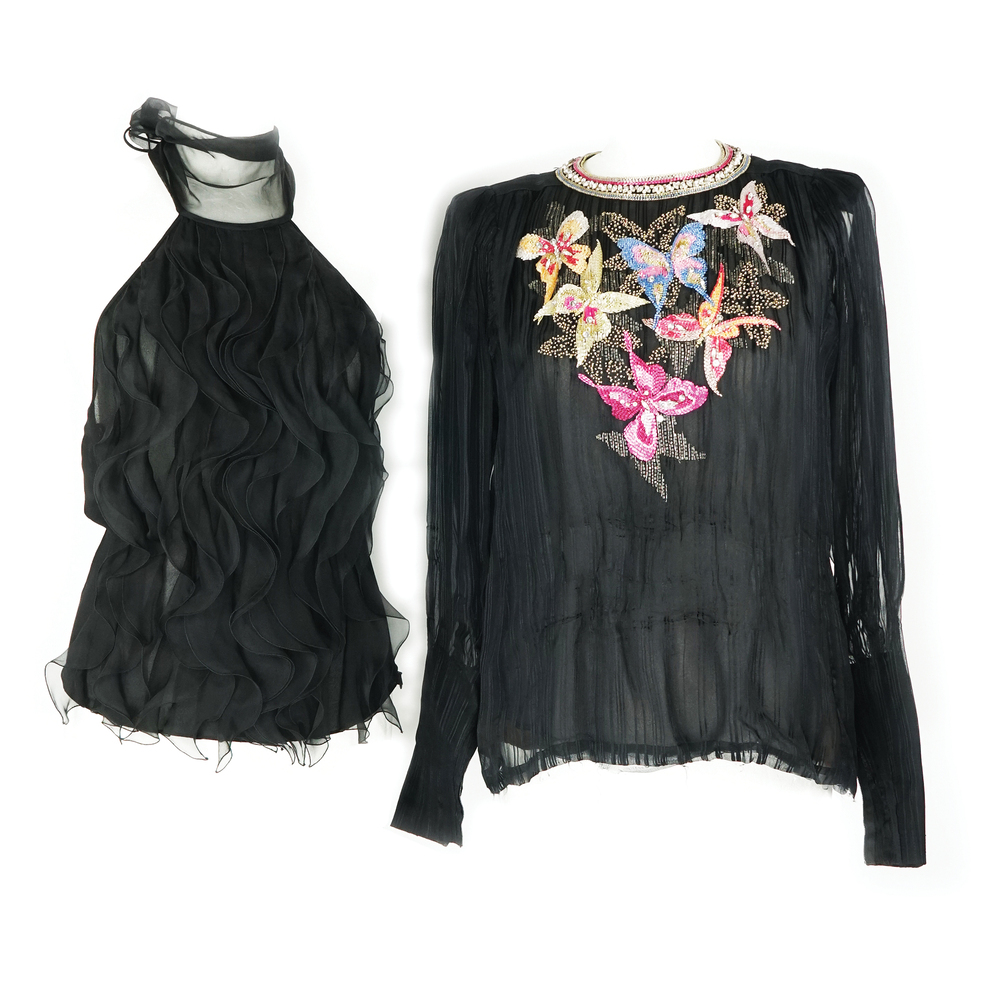 Emanuel Ungaro camicia di seta nera con paillettes multicolor ricamate a farfalle e top di organza nera