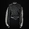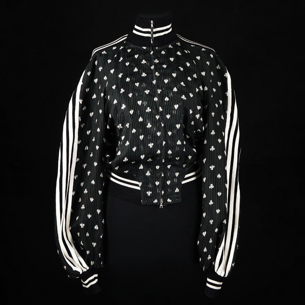 Jean Paul Gaultier giubbotto in seta nera con stampa a picche, fiori e cuori in bianco; chiusura a zip e profili di maglia canneté a righe, tg. I 40