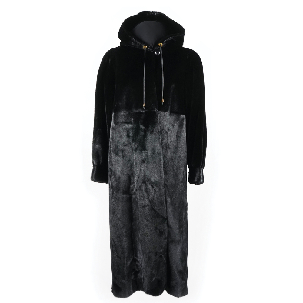 Cappotto di visone rasato nero con cappuccio; tasche a fessura; manica arricciata sul polso