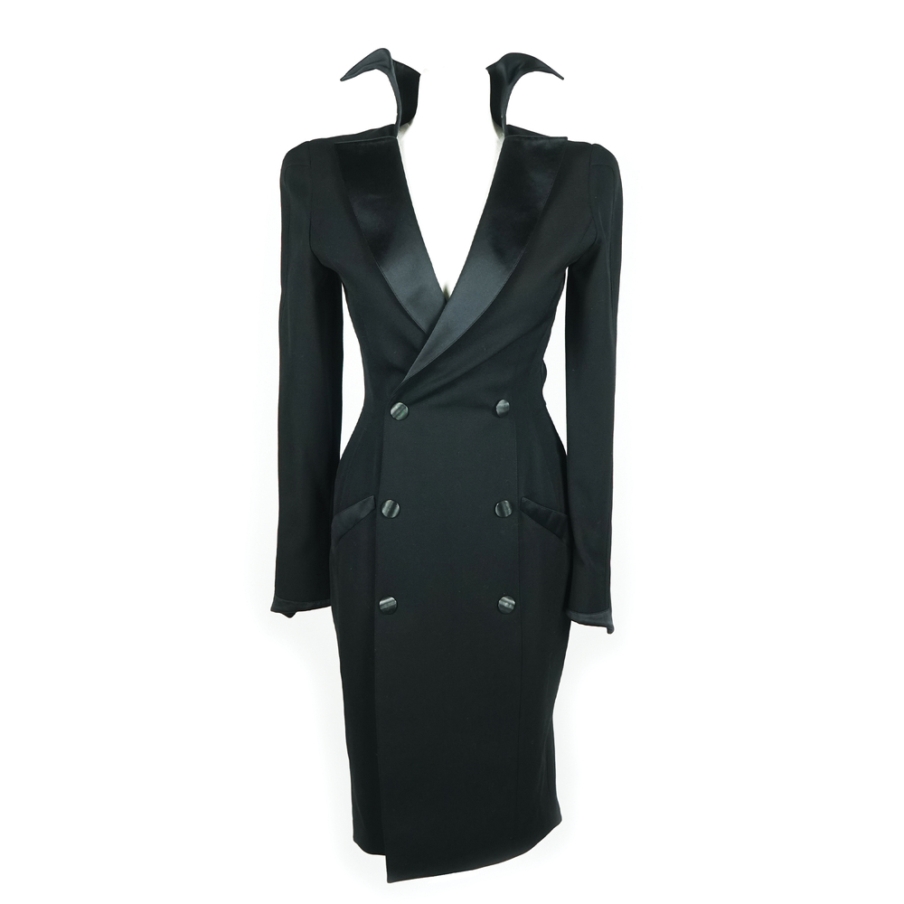 Thierry Mugler robe manteau in lana, seta e pvc nero, tg. 36