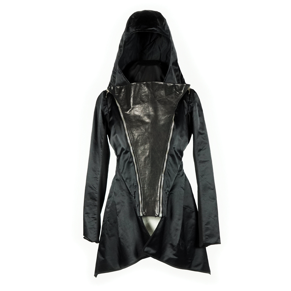 Rick Owens giacca con cappuccio in raso nero con inserto a doppia zip in pelle sul davanti