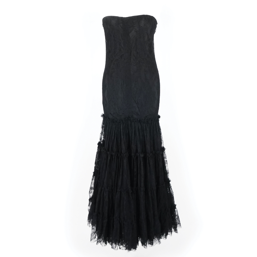 Jean Paul Gaultier abito bustier lungo in pizzo nero con gonna a balze