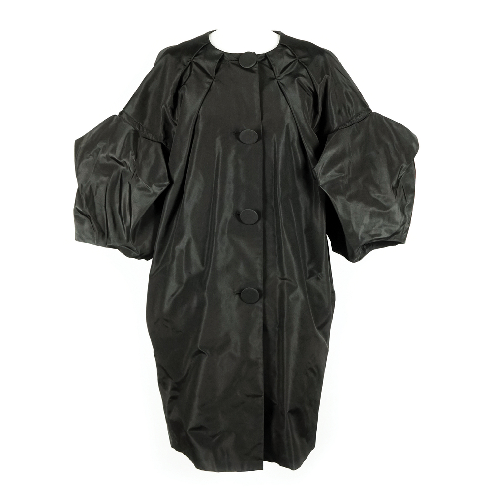 John Galliano caban in seta nera con maniche a palloncino e fodera logata in raso di seta nera; grandi bottoni a pasticca foderati in tessuto, tg. 42