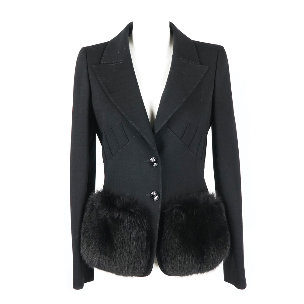 Valentino giacca in lana nera con nervature impunturate e tasche a toppa di volpe nera, tg. 6 (nuova con cartellino)