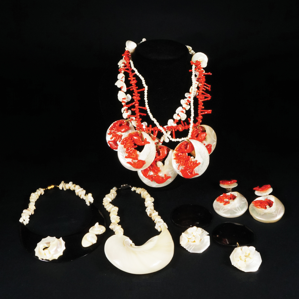 Due demi parures composte ciascuna da una collana e una coppia di orecchini in madreperla, conchiglia e finto corallo UNITE a una collana in madreperla (qualche difetto)