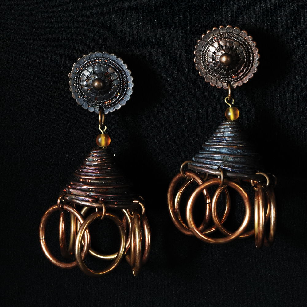 Jean Paul Gaultier coppia di orecchini in rame a gomitolo con pendenti a cerchio; stampigliati JPG all'interno