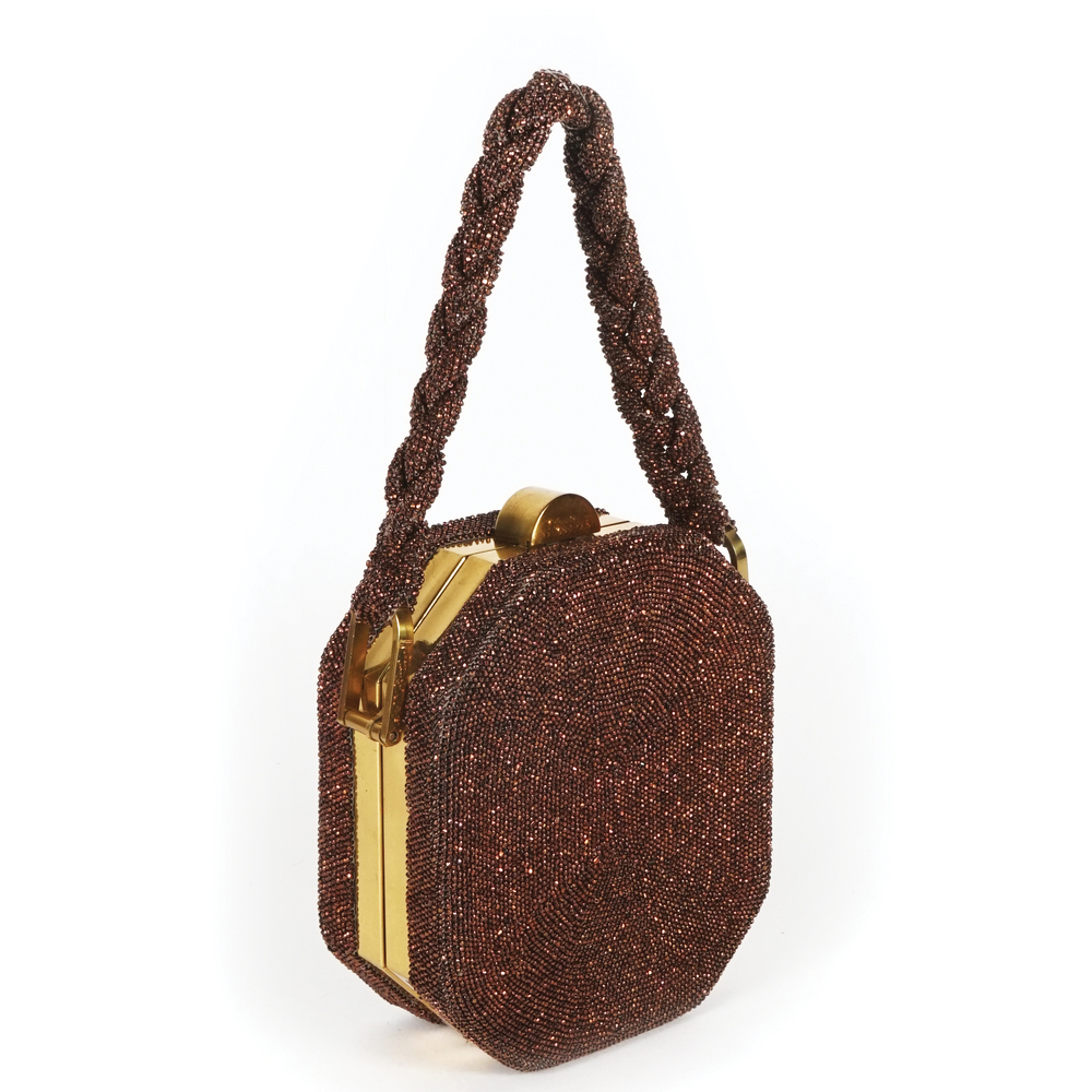 M.E. Product borsetta a mano di forma ottagonale in tessuto rivestito di perline marroni con montatura in ottone dorato