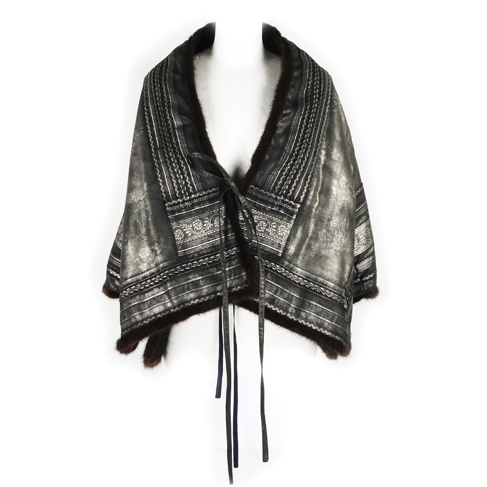 Jean Paul Gaultier giubbino a kimono in seta e poliestere grigio/argento con bordi in visone marrone.