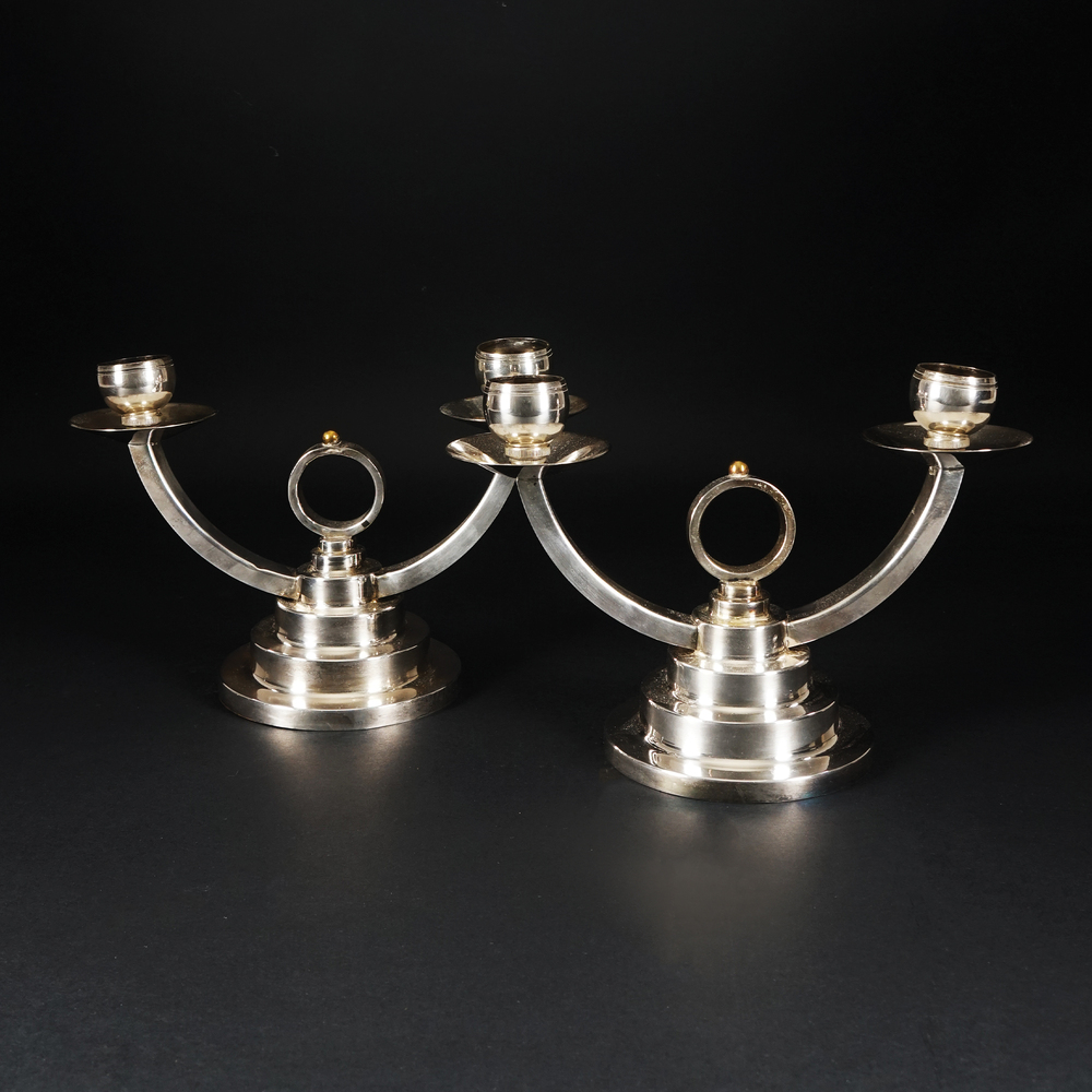 Coppia di doppieri in metallo argentato con due bracci ricurvi e base circolare gradinata; presa ad anello; stampigliati Flocon. Predisposti per l'illuminazione, cm. 19x27