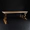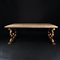 Coppia di tavoli in ferro dorato; montanti a volute stilizzate; piano rettangolare di travertino, cm. 59,2x165x90