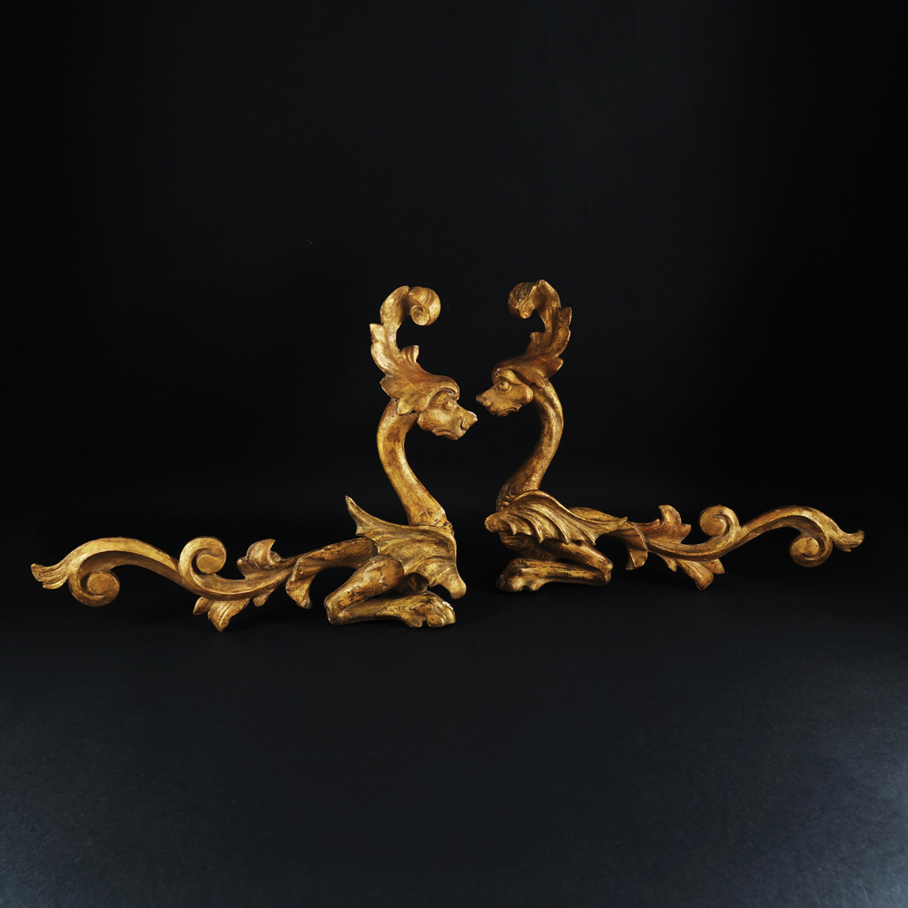 Coppia di fregi in legno dorato scolpito a raffigurare un drago di profilo,...