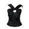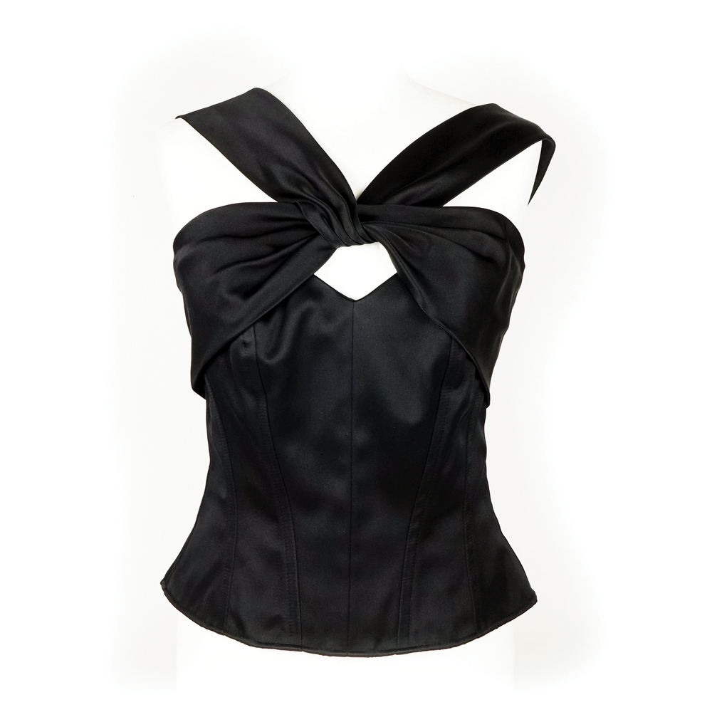 Chanel corsetto in raso nero con scollo incrociato sul davanti e fodera logata