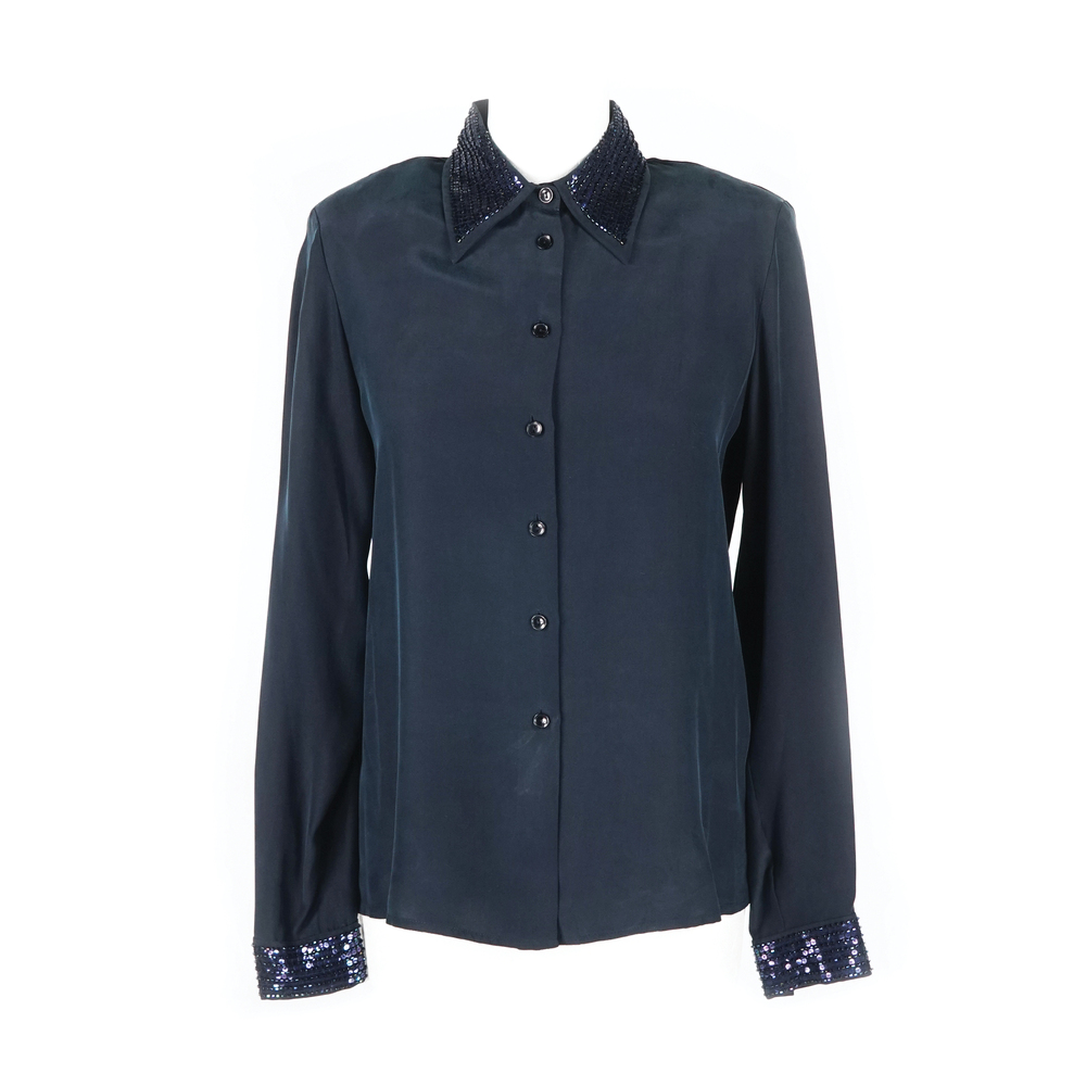 Jones New York camicia di seta blu con collo e polsini di paillettes blu, tg. 4