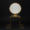 Specchio da tavolo di forma circolare girevole con montatura in metallo dorato su piede rettangolare in vetro specchiato. Poggiante su supporto parimenti in metallo dorato, complessivamente cm. 75x56x21