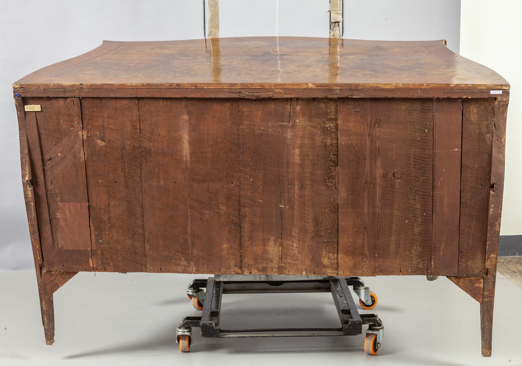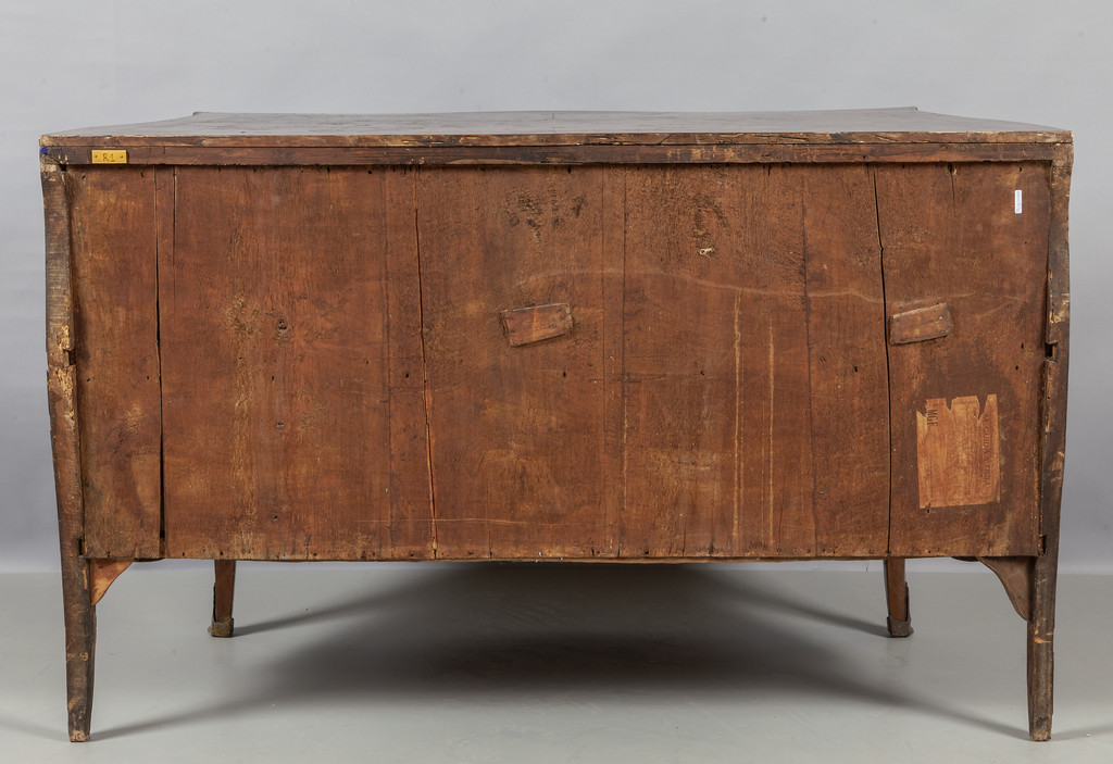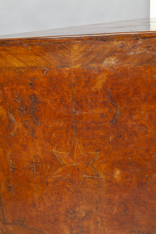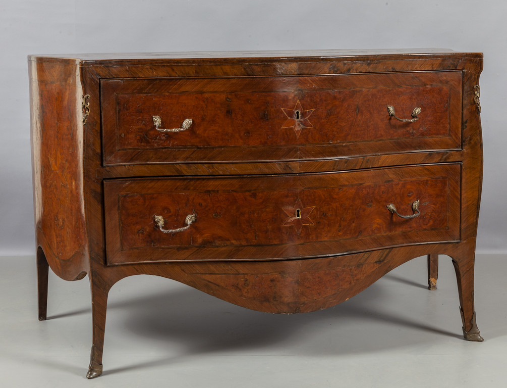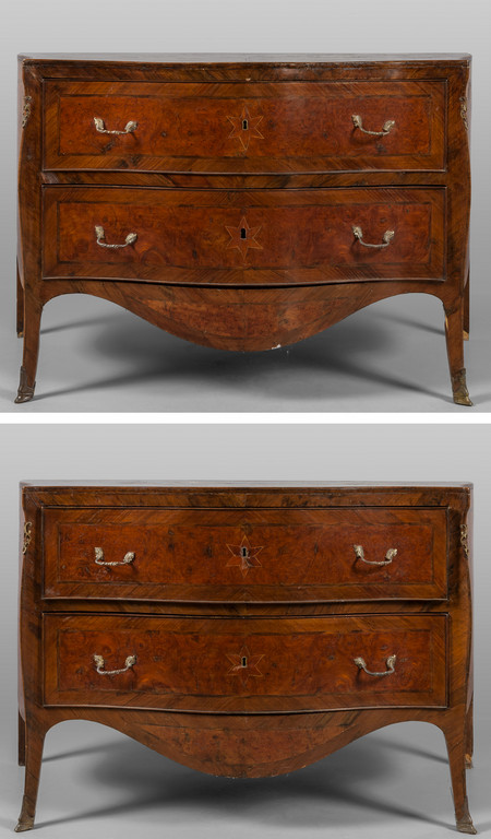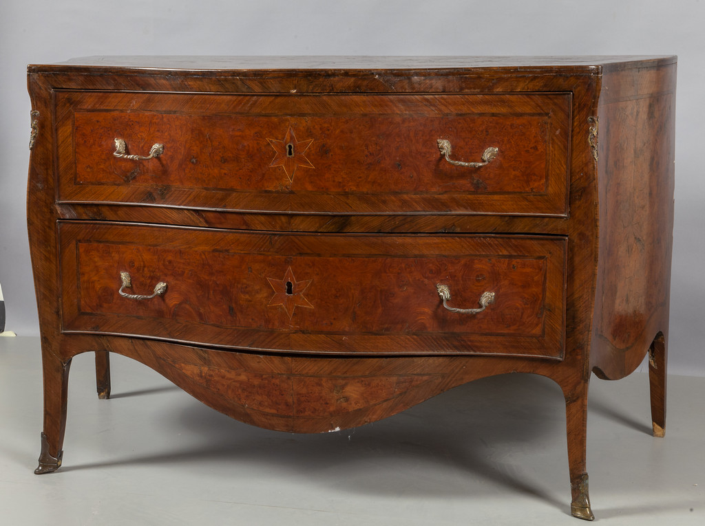 Coppia di comò Luigi XIV movimentati sul fronte e sui fianchi a due cassetti lastronati in noce e radica di tuja e filettati in bois de rose bronzi d'epoca Napoli sec.XVIII