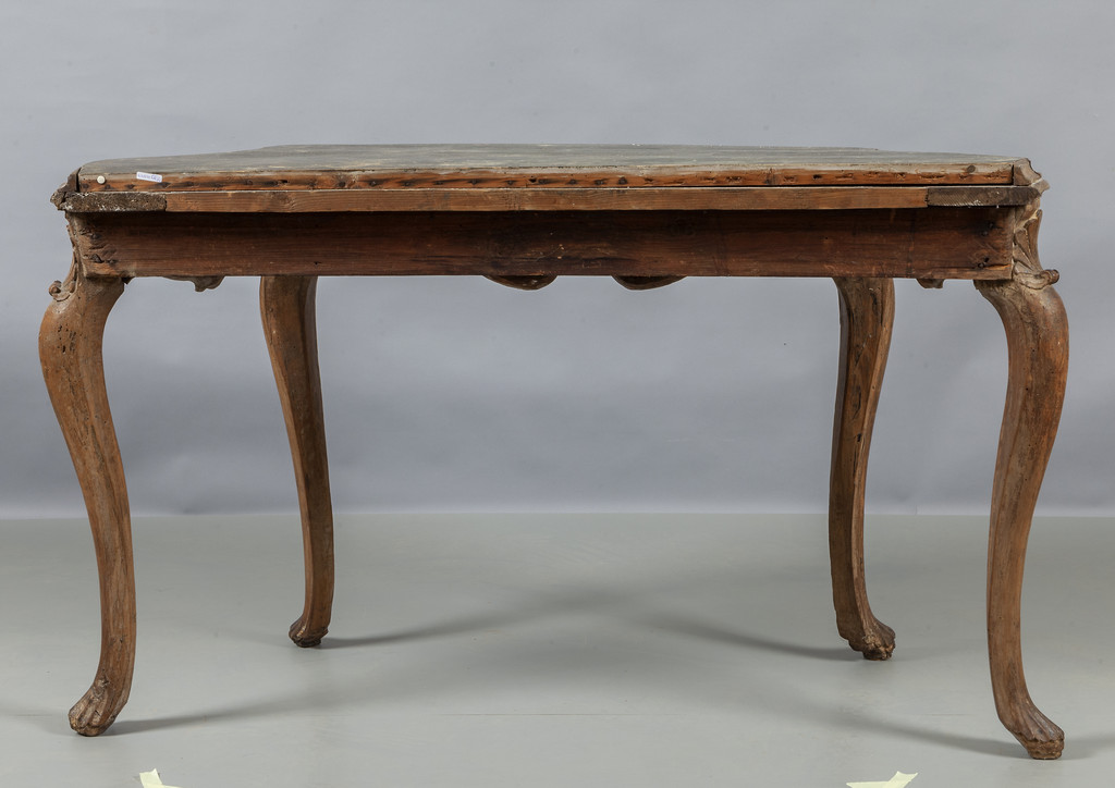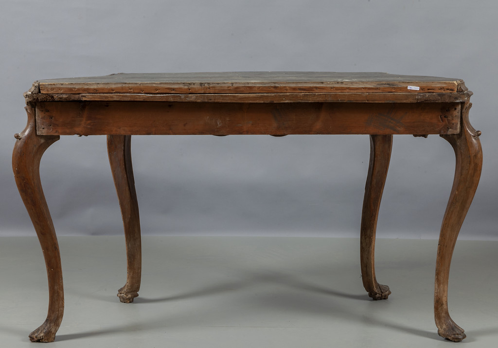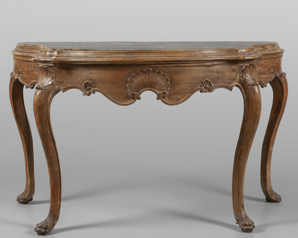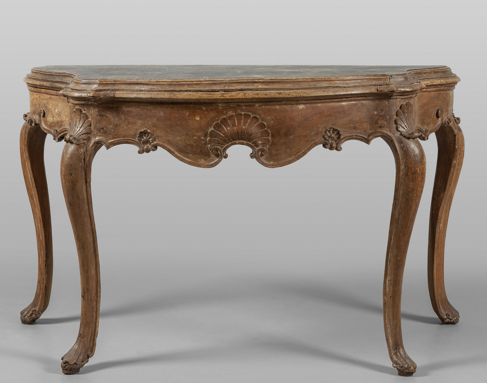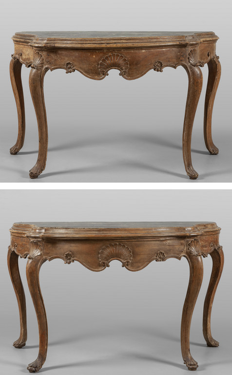 Coppia di consoles Luigi XV movimentate sul fronte e sui fianchi e riccamente intagliate con conchiglie Venezia I metà sec.XVIII
