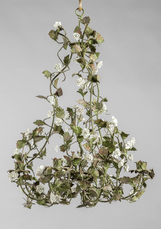 Lampadario in ferro laccato a sei luci con fiori in porcellana bianca fine sec.XVIII