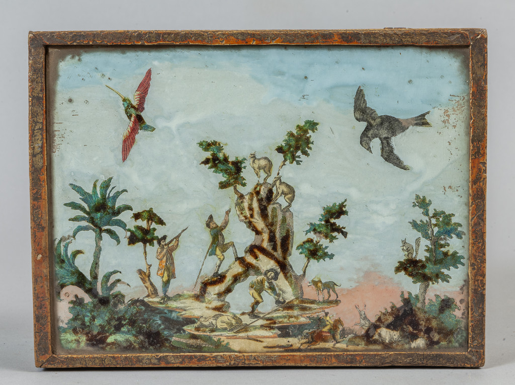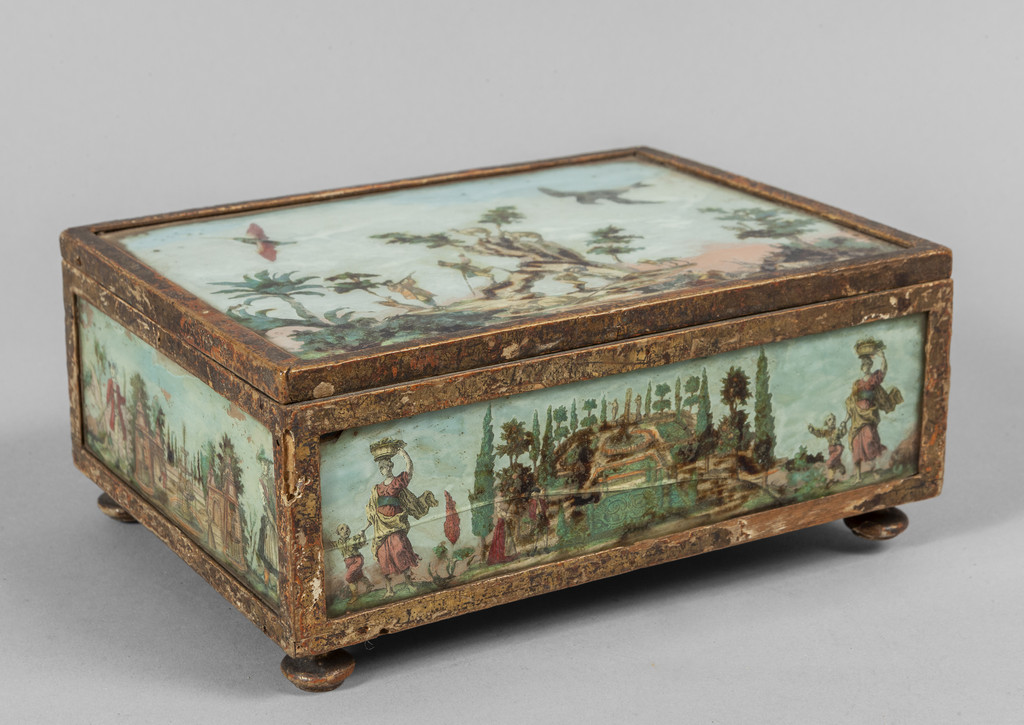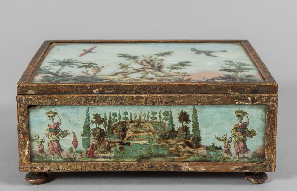 Scatola in vetro con applicazioni di figurine in arte povera Venezia sec.XVIII