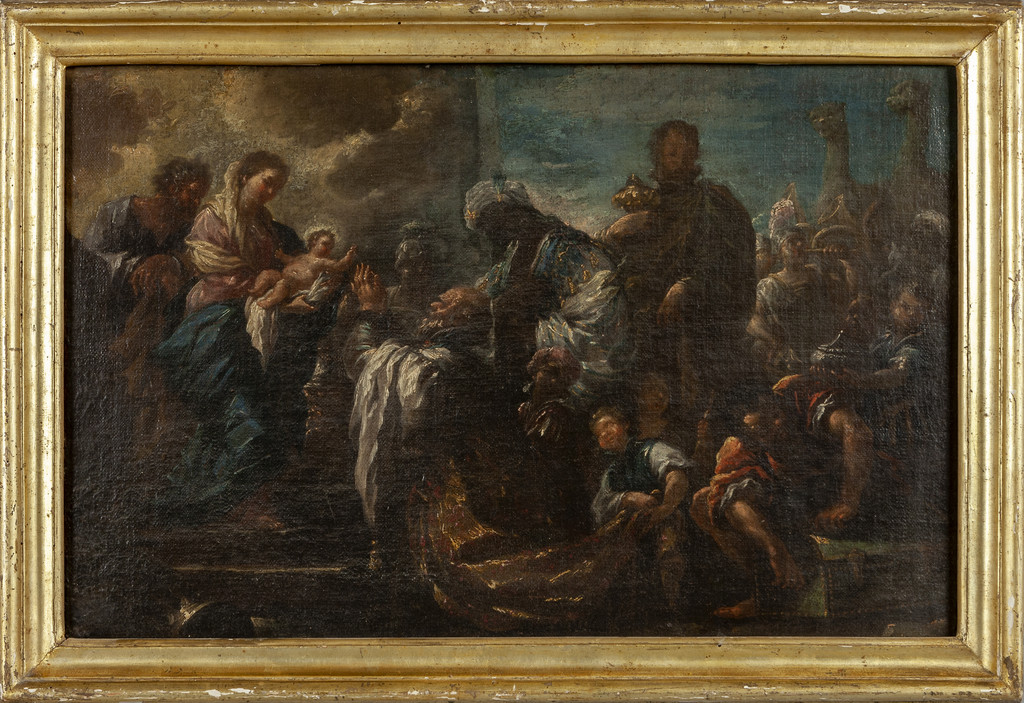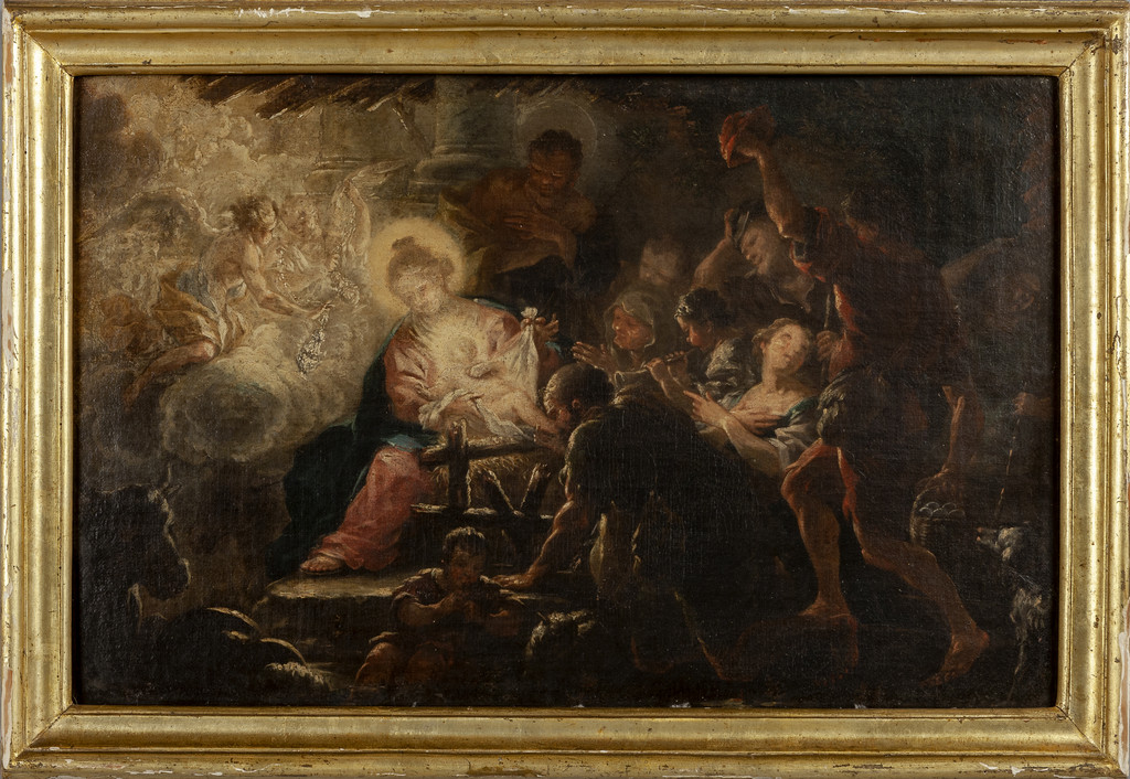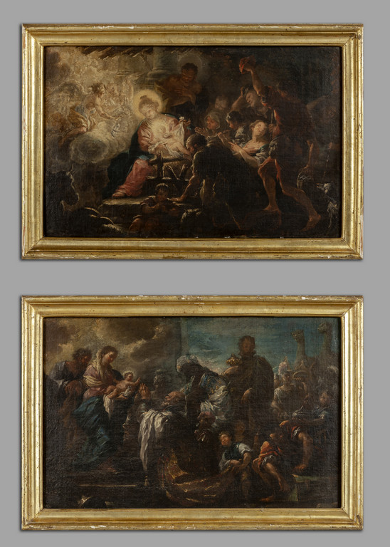 Scuola napoletana sec.XVII (G.Del Po) 'Adorazione dei Magi' e 'Adorazione dei pastori' coppia di olii cornici coeve in legno dorato