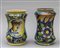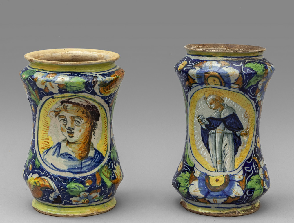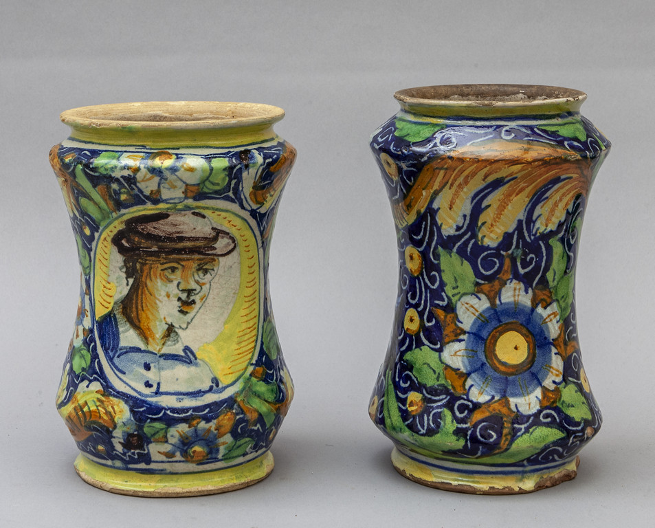 Due albarelli in maiolica policroma con al centro medaglioni con personaggi Venezia sec.XVI