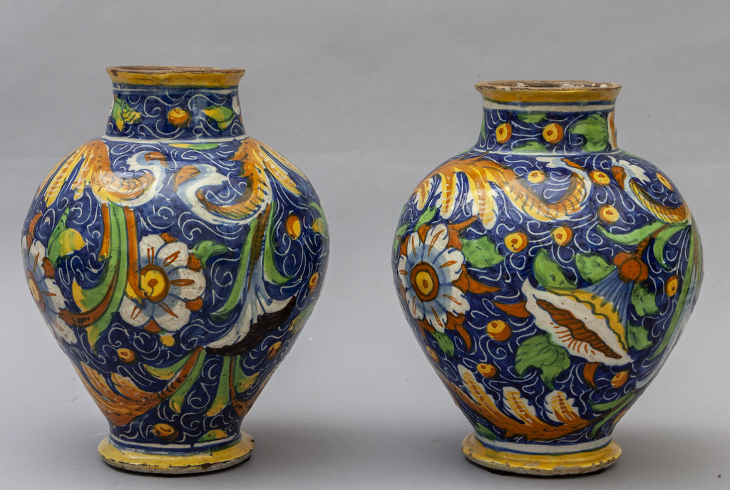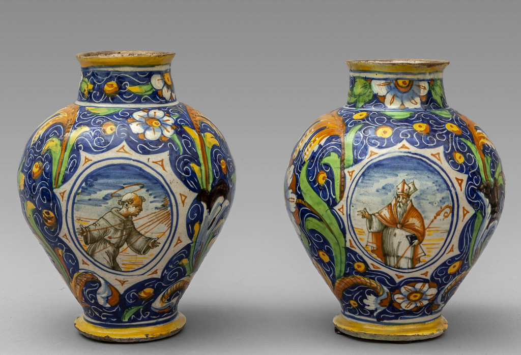 Coppia di bocce in maiolica policroma con al centro figure di santi Venezia sec.XVI